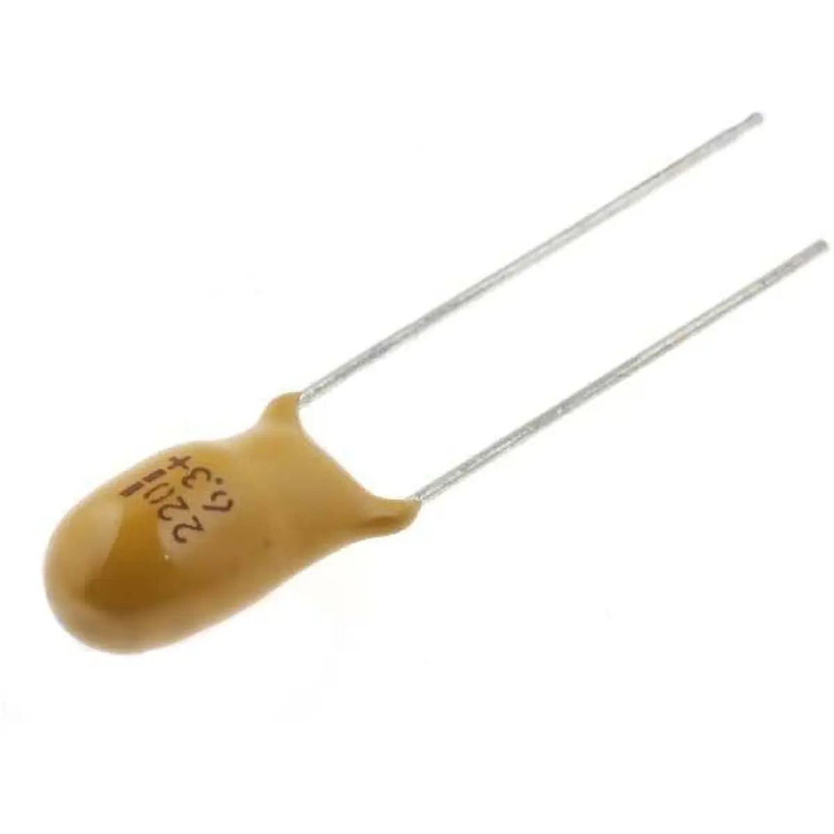 Condensador de tântalo de 220uF, 6,3V, com montagem THT, tolerância de ±20% e temperatura de funcionamento entre -55°C e 85°C, com distância entre pinos de 5,08 mm. Ideal para circuitos que exigem estabilidade de capacitância e funcionamento fiável em variações de temperatura.