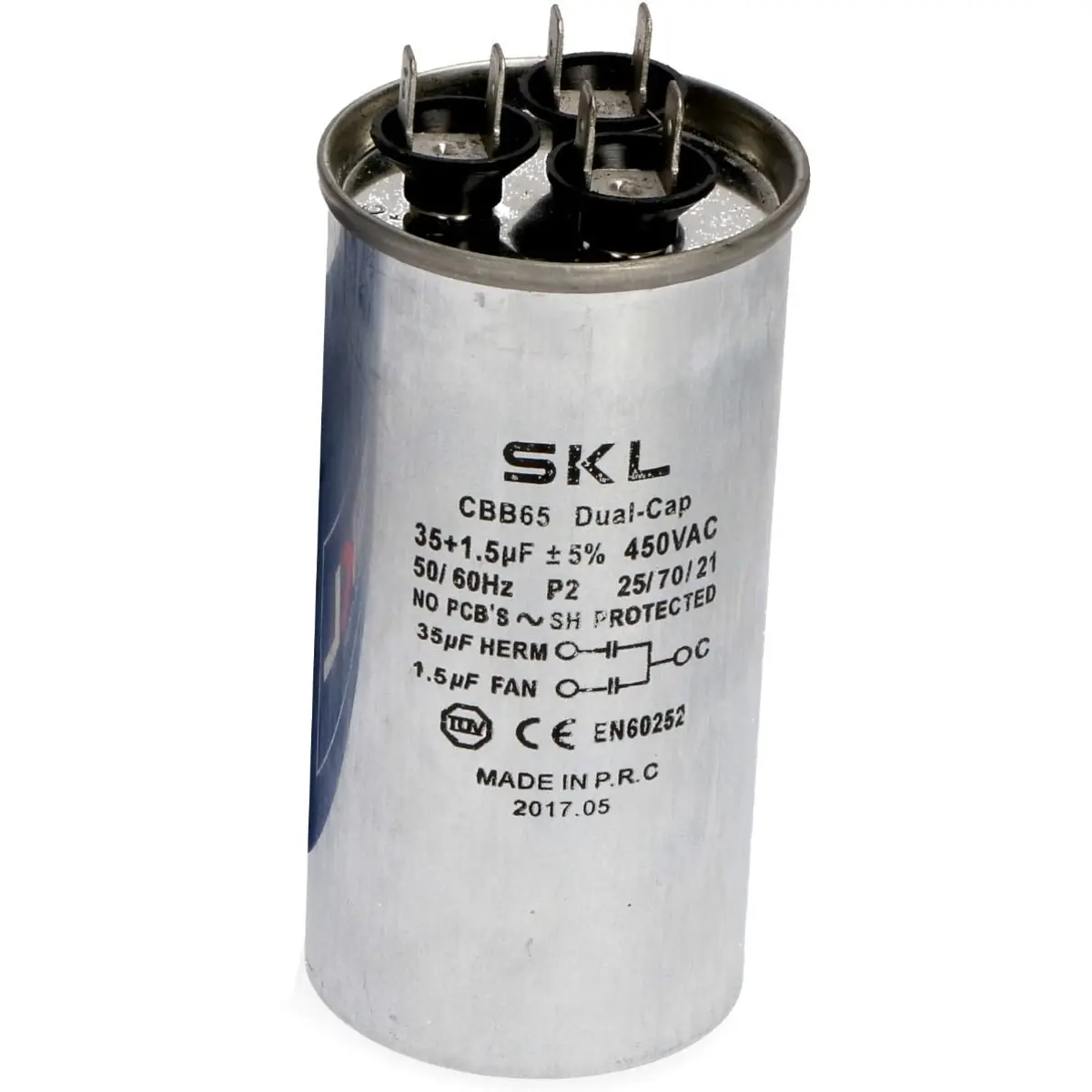 Condensador para ar condicionado com 450V e 50-60 Hz, capacitância de 35uF + 1,5uF, dimensão Ø50x90mm. Destina-se a bombas de calor e ar condicionado, oferecendo fiabilidade, substituição direta e desempenho estável em climatização. Ideal para técnicos e instaladores que procuram peças compatíveis com condensadores padrão, com durabilidade, eficiência energética e operação estável.