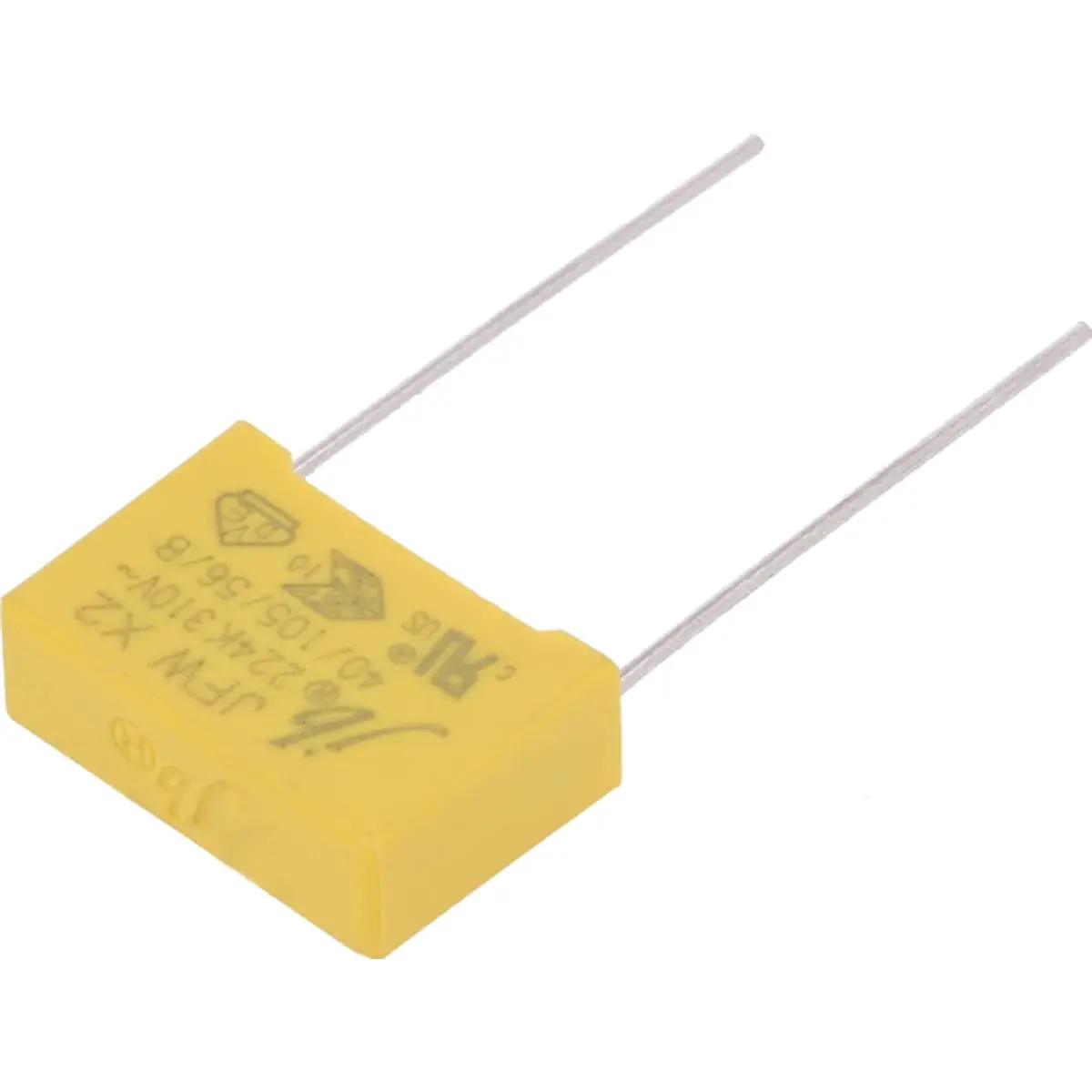 Condensador de polipropileno, classe X2, com capacidade de 220 nF e tensão de trabalho até 310 V AC. Montagem THT com espaçamento entre terminais de 15 mm e carcaça de 18 x 12 x 6 mm. Tolerância de ±10%. Destina-se à supressão de interferências em circuitos elétricos, proporcionando filtragem estável de ruídos em fontes de alimentação e em aplicações de filtragem de linha.