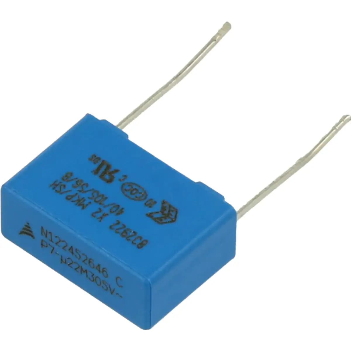 Condensador de filme de polipropileno X2 com capacitância de 0,22 µF e tensão de serviço até 305 V AC. Destina-se a filtragem em fontes de alimentação e circuitos de controlo, com montagem THT e dimensões de 18 x 12,5 x 7 mm, comprimento de terminais de 6 mm e espaçamento de 15 mm. Tolerância ±20% e classe climática 40/105/56 segundo IEC 60068-1, oferecendo fiabilidade em ambientes com variações de temperatura, adequado para aplicações industriais.