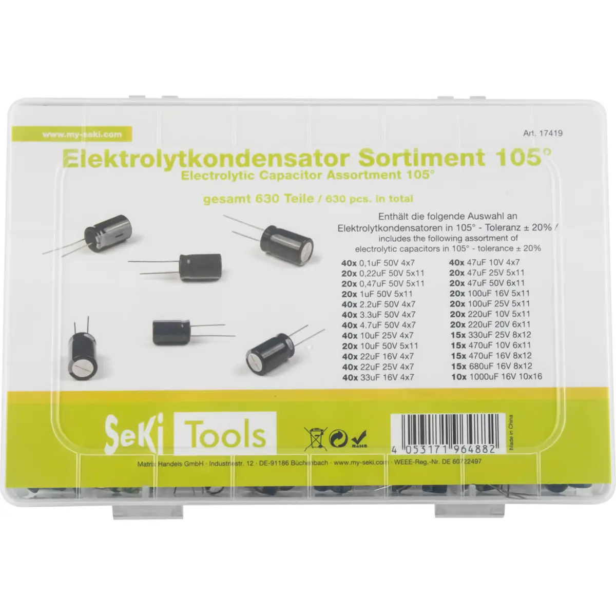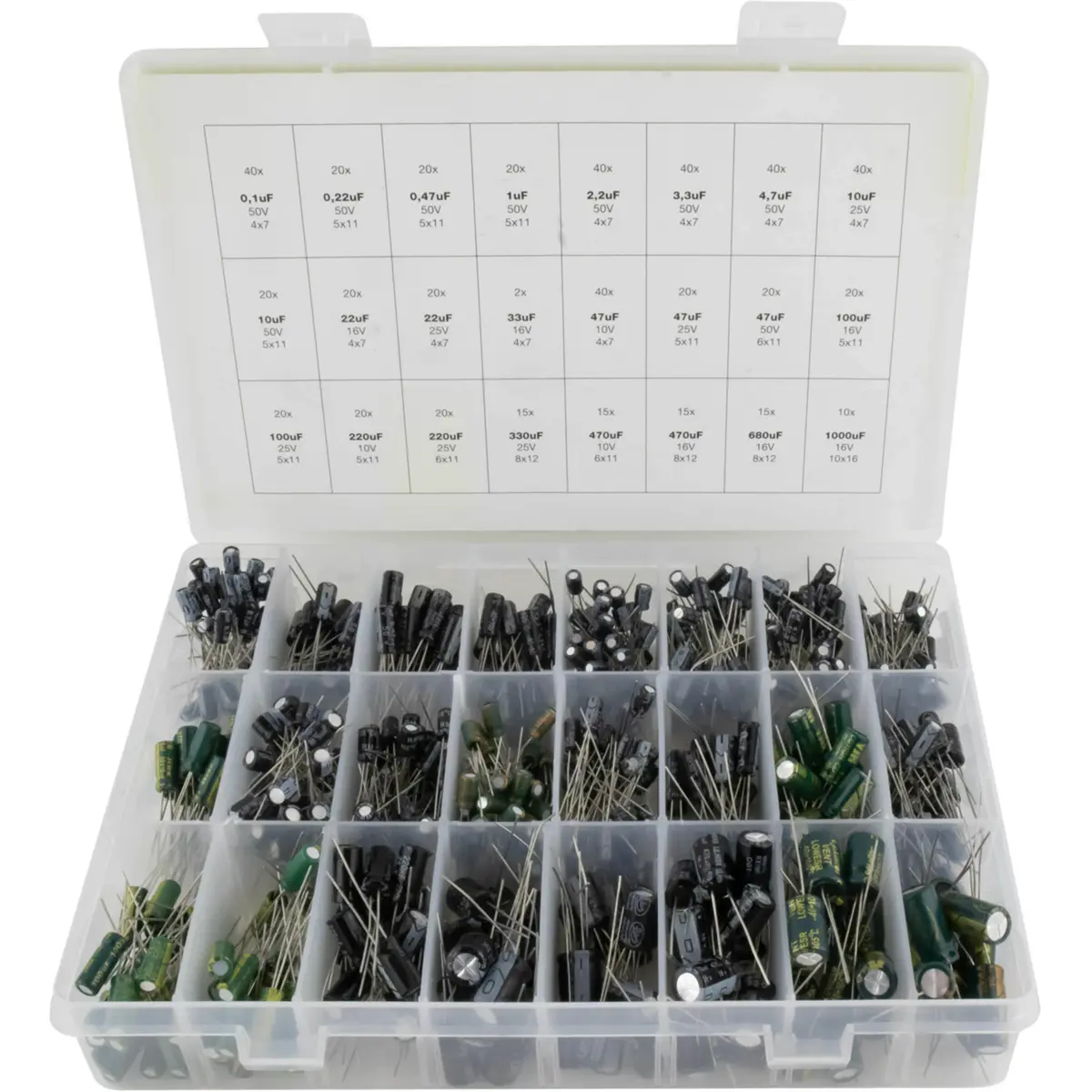 Conjunto sortido de condensadores eletrolíticos com temperatura de 105° e tolerância de ±20%. Inclui várias capacidades, de 0,1uF a 1000uF, com tensões de 10V a 50V, e encapsulamento Ø4x7mm ou Ø5x11mm. Ideal para aplicações de filtragem, desacoplamento e estabilização de fontes em circuitos eletrónicos, permitindo otimizar o dimensionamento com uma variedade de valores num único pack, sem referência a marcas.