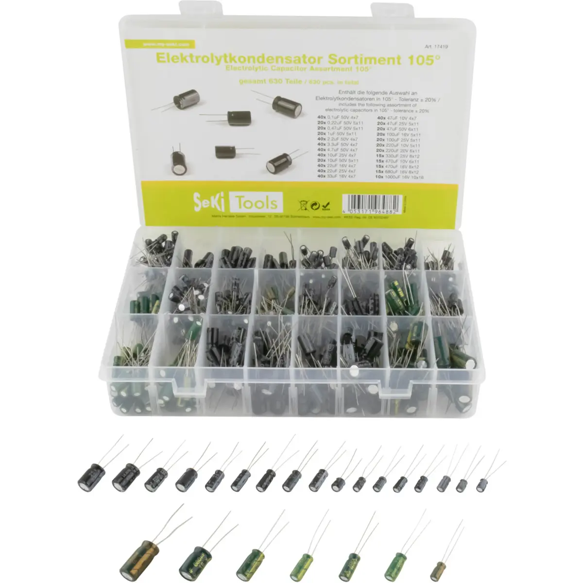 Conjunto de 630 condensadores eletrolíticos (vários valores)