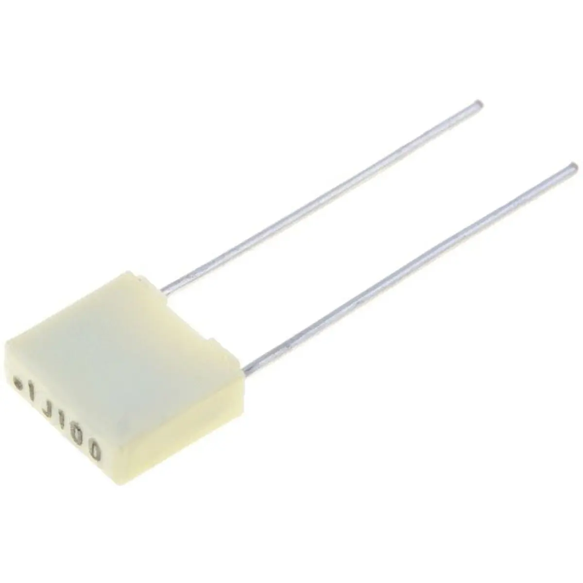 Condensador poliéster de 100nF com tensões de funcionamento até 100VDC e 63VAC. Montagem THT, distância entre pinos de 5mm e tolerância de ±5%. Dimensões compactas (7,2 x 2,5 x 6,5 mm). Classe climática 55/105/56 IEC 60068-1, temperatura de funcionamento de -55 °C a 105 °C, resistência a pulso de 200 V/µs, em conformidade com AEC-Q200.