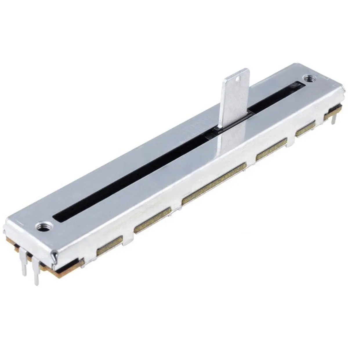 Potenciômetro deslizante linear estéreo de metal com potência de 200 mW e tolerância de ±20%. Suporta tensões máximas de 150 VAC ou 10 VDC, com veio de 8x1.2x12 mm e percurso de 60 mm para ajuste preciso. Dimensões externas de 88x16x8 mm facilitam a montagem em painéis. Adequado a equipamentos que exigem controlo suave de sinal, resistência mecânica e fiabilidade em aplicações com sinal estéreo.