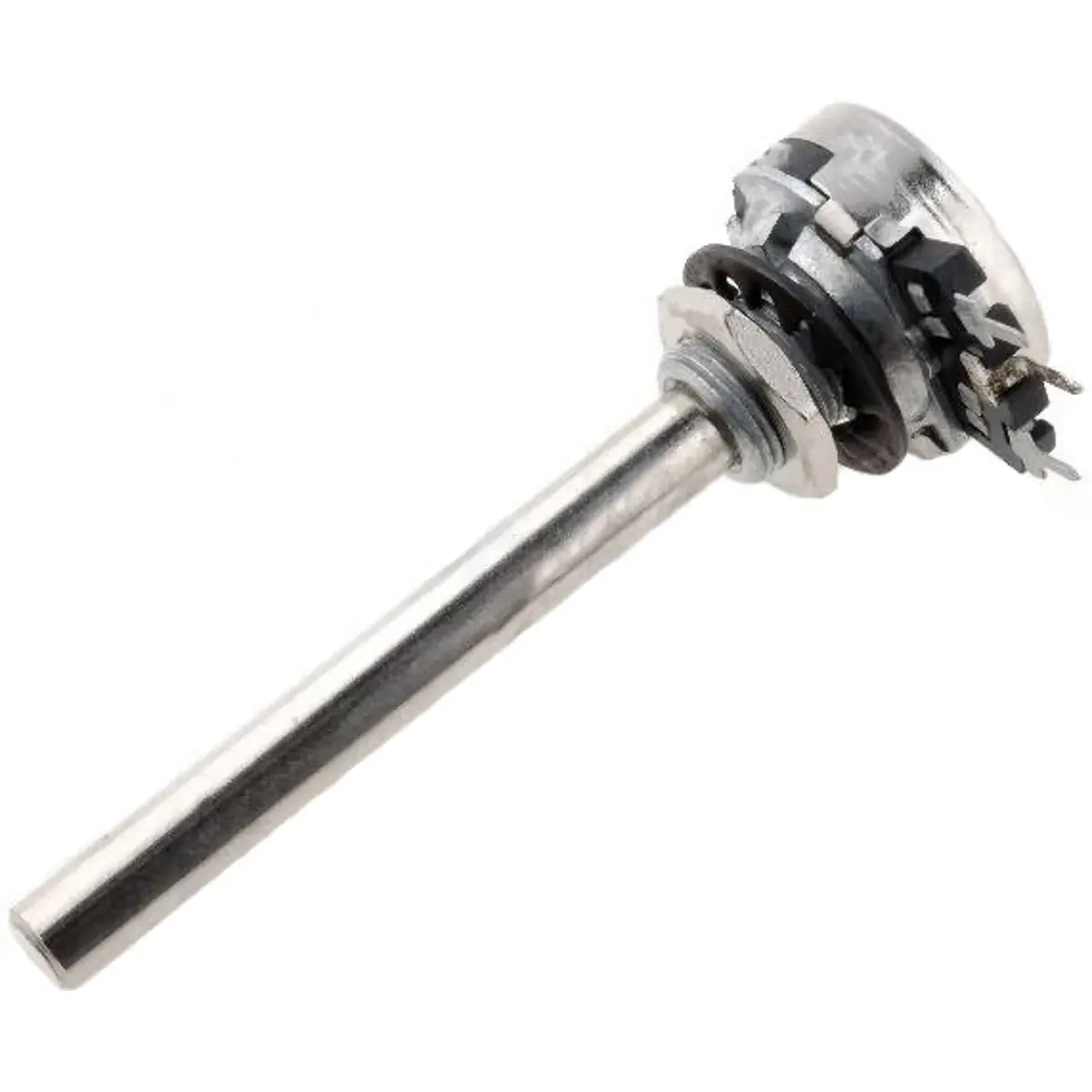Potenciômetro linear mono metálico com resistência de 1 kΩ e potência de 200 mW, destinado a montagem em placa através de THT. Possui eixo de 6 mm de diâmetro, comprimento de 50 mm e rosca de 9 mm, suportando até 500 VDC. Adequado para ajustes precisos de controlo de sinal em circuitos de potência moderada, calibração de ganho e aplicações em eletrónica onde se requer fiabilidade e montagem simples.