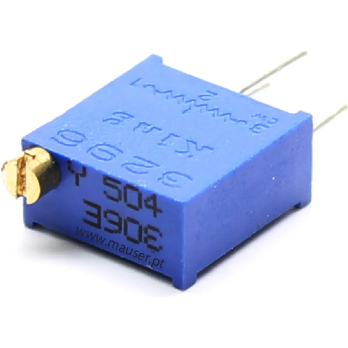 Potenciômetro multivolta, linear e vertical, série 3296W, com resistência de 500 kΩ, distância entre pinos de 4 mm e dimensões de 9.8x9.8x5 mm, concebido para ajustes precisos de tensão em circuitos. Ideal para controlo de ganho, calibração e ajuste fino em placas de circuito impresso, assegurando resposta estável, repetibilidade e montagem simples, sem depender de marcas.
