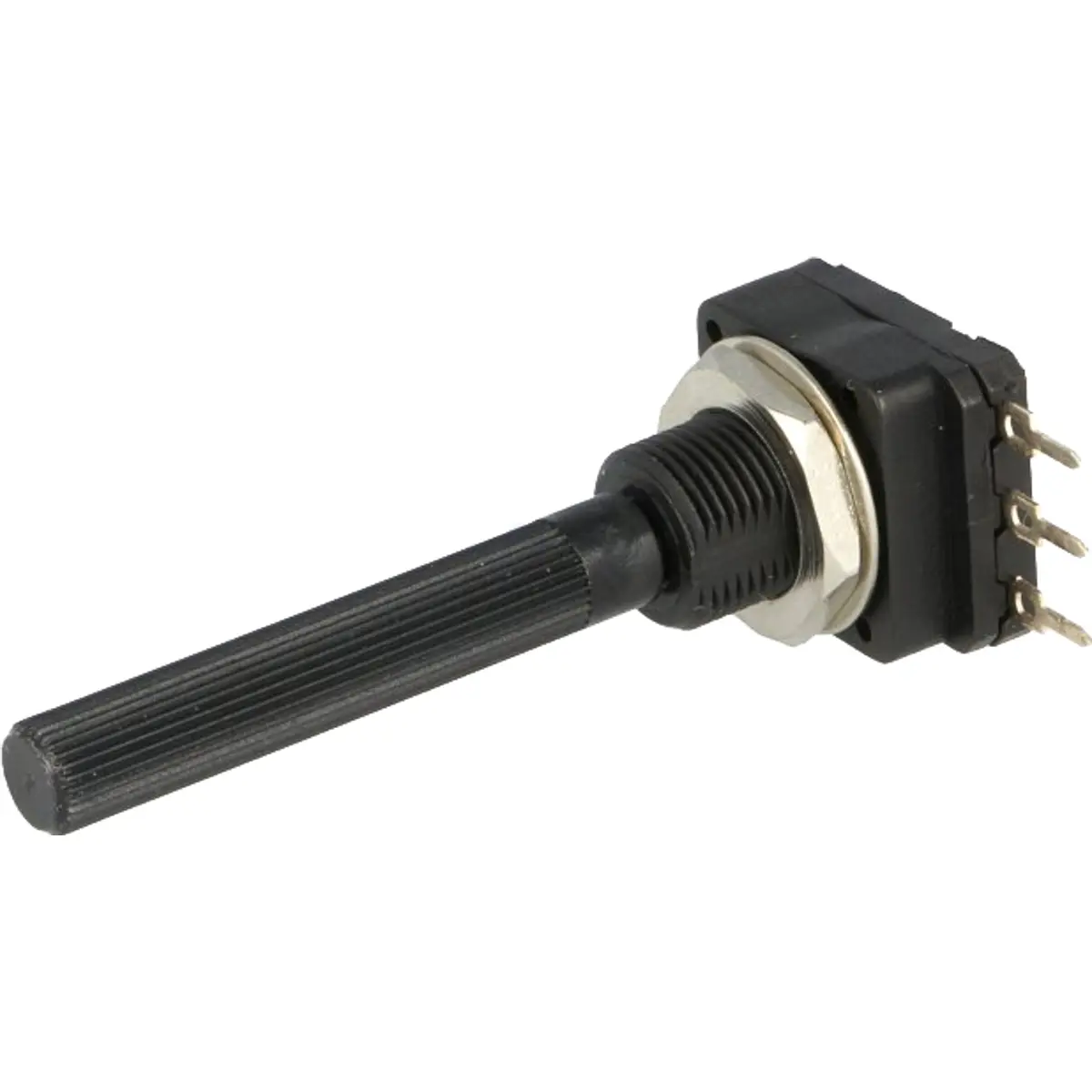 Potenciômetro linear de corpo plástico com veio de 6 mm de diâmetro, 36 mm de comprimento e rosca de 9 mm, com resistência de 500R e potência de 0.2W. Adequado para ajuste de resistência em circuitos, oferecendo controlo estável de posição em aplicações de automação e electrónica.