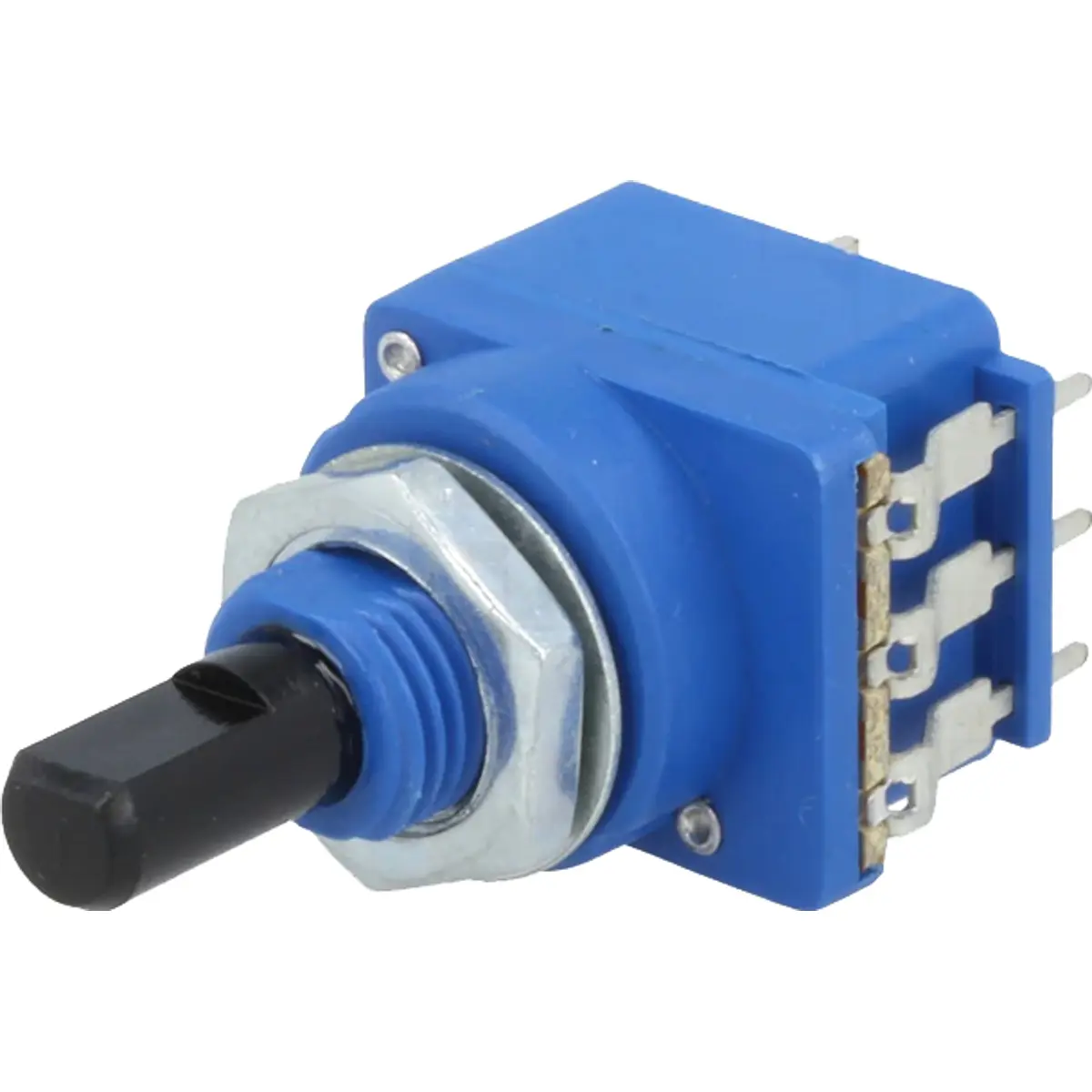 Potenciômetro de 100kΩ com interruptor de pressão, do tipo axial, com dimensões de 20.5x17.2x17mm e profundidade de corte de 1.5mm. Possui superfície do veio com incisão D.
