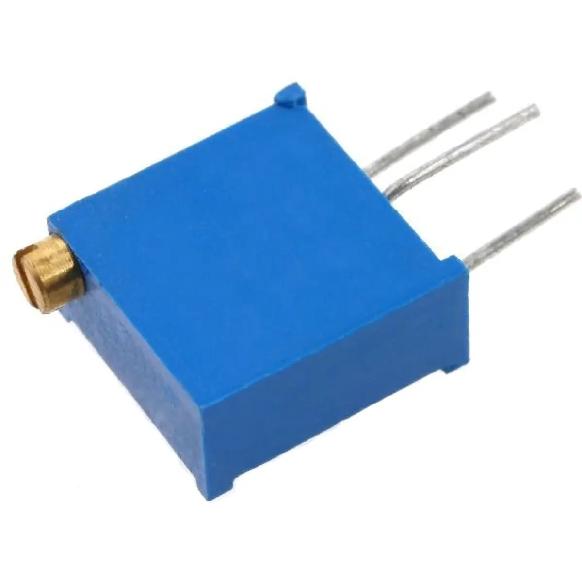 Potenciômetro multivolta linear vertical para montagem em placa (THT), com 25 voltas elétricas, resistência de 5 kΩ, potência de 500 mW e tolerância de ±10%. Suporta até 300 V e opera entre -55 °C e 125 °C, em corpo de cermet. Raster de conexões de 2,54 mm e padrão de potenciômetro 3/8". Dimensões da carcaça: 10 x 9,5 x 4,8 mm.