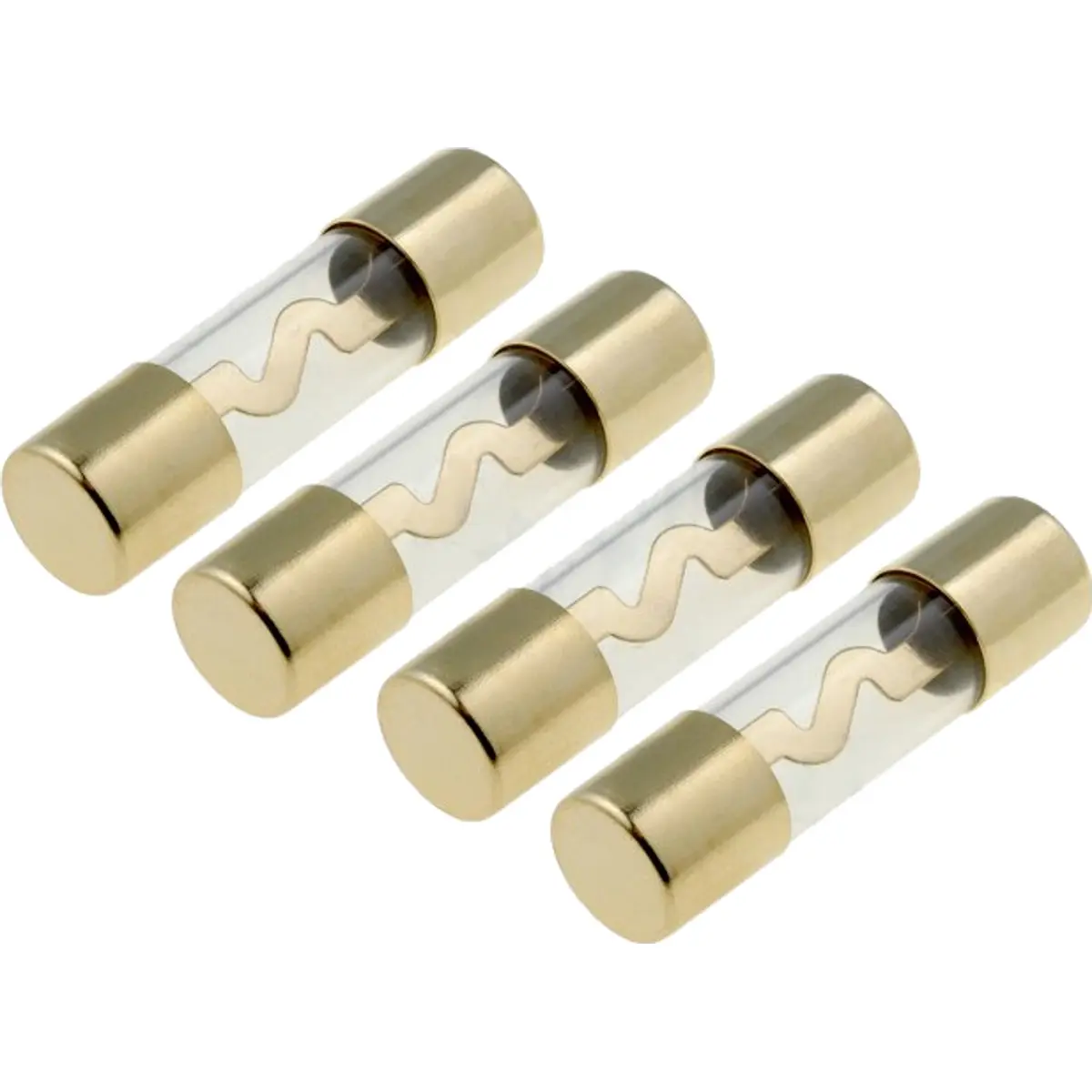 Fusível automóvel de baixa tensão, com corpo de vidro, contacto dourado e guia em ouro. Dimensão 10x38mm, corrente nominal de 50A. Conjunto com 4 unidades, fabricado pela ACV, adequado a circuitos de áudio automóvel para proteção contra sobrecargas e curto-circuitos em sistemas eléctricos de baixa tensão.