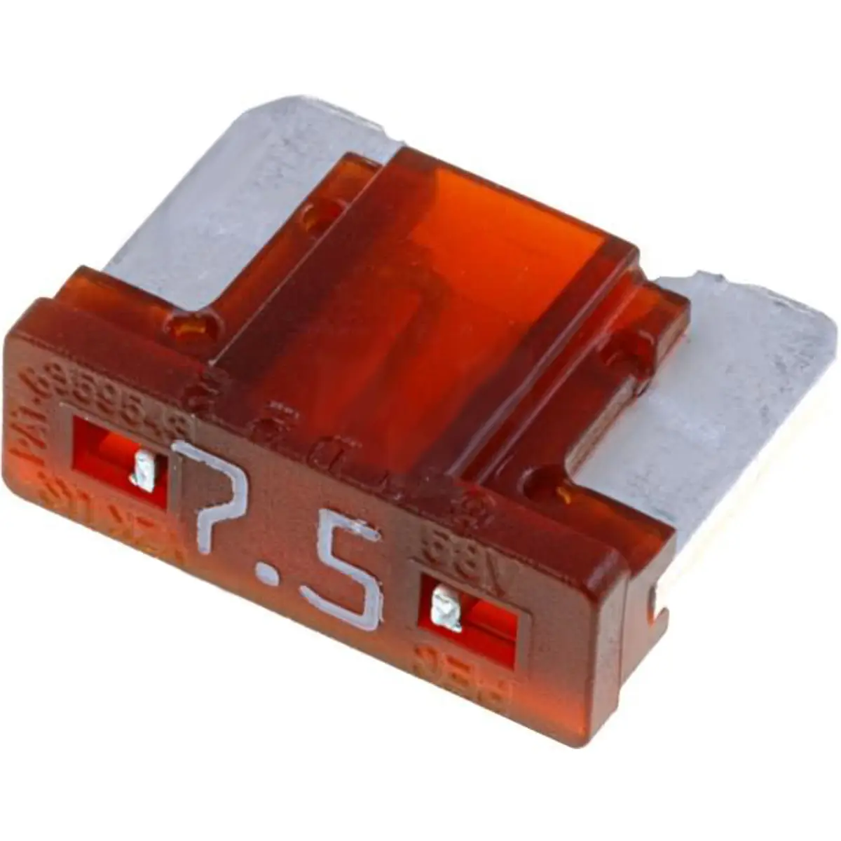 Fusível automotivo de baixo perfil, com corrente nominal de 7,5 A e tensão nominal de 32 V, na cor castanha. Trata-se de um componente de proteção utilizado em circuitos automotivos para interromper o fluxo elétrico em caso de sobrecarga, mantendo o sistema estável num espaço compacto. O formato reduzido facilita a integração em caixas de fusíveis automotivos sem referência de marca.