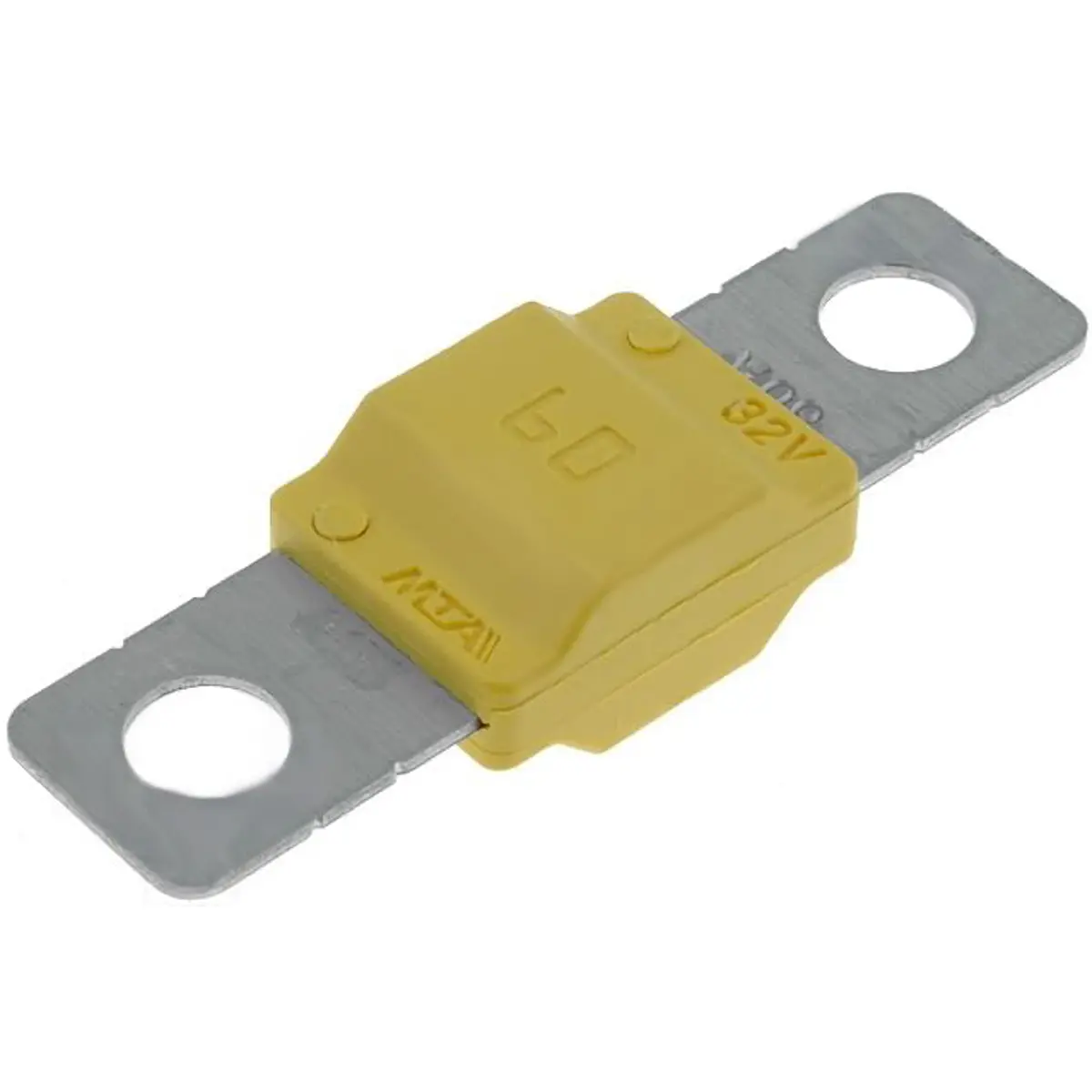 Fusível automotivo de baixa tensão com corrente nominal de 60 A e tensão nominal de 32 V. Cor amarelo, tamanho 40 mm, montagem por parafuso M5. Parte da série MIDI, adequado para sistemas automotivos e aplicações industriais. Suporta faixa de temperatura de -40 °C a 125 °C, proporcionando proteção confiável contra sobrecorrente.
