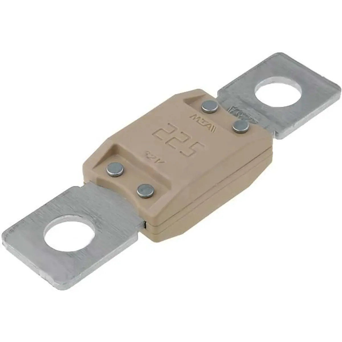 Fusível automotivo de baixa tensão com tensão nominal de 32V e corrente nominal de 225A, comprimento de 68.6mm e acabamento na cor bege. Proporciona proteção de circuitos em sistemas elétricos automotivos, evitando sobrecargas e curtos-circuitos. Ideal para instalações que requerem proteção confiável, resposta rápida e compatibilidade com fusíveis de formato e especificação semelhantes em quadros elétricos de veículos com alta demanda de corrente.