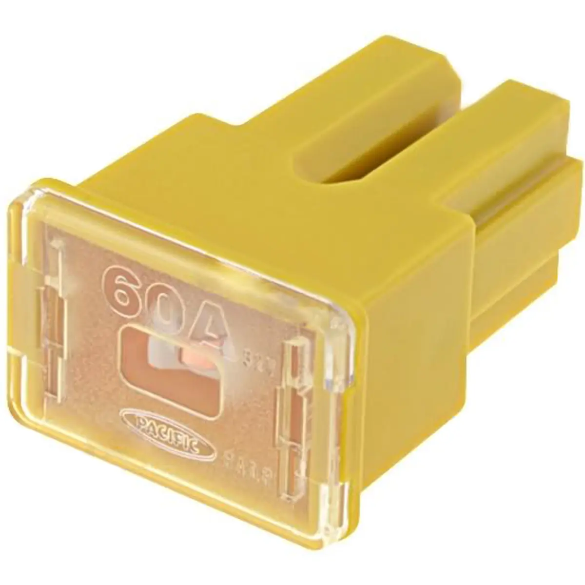 Fusível automotivo de baixa tensão com corrente nominal de 60A e tensão máxima de 32V. Destina-se a circuitos elétricos de veículos, fornecendo proteção contra sobrecargas e curtos-circuitos. Apresenta cor amarela para identificação e facilita a substituição de fusíveis. Este componente é adequado para aplicações automotivas que operam a 32V, assegurando compatibilidade com sistemas de baixa tensão.