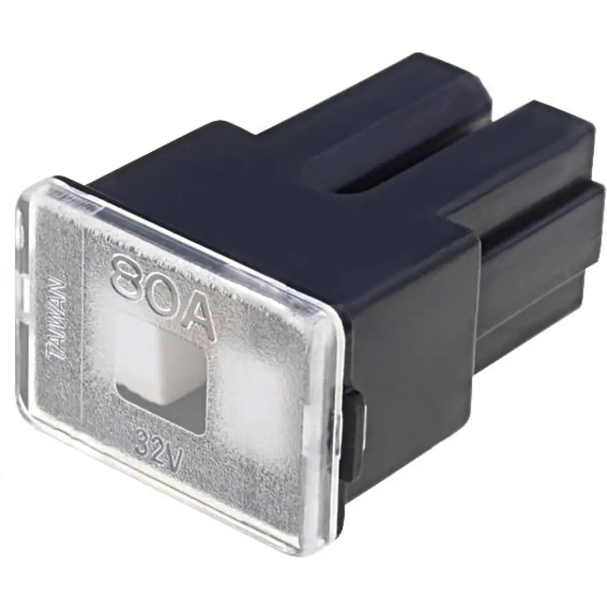 Fusível automotivo de baixa tensão com corrente nominal de 80A e tensão máxima de 32V, concebido para proteção de circuitos elétricos em veículos. De cor preta, facilita a substituição de fusíveis, prevenindo sobrecargas e curtos-circuitos no sistema elétrico do veículo.