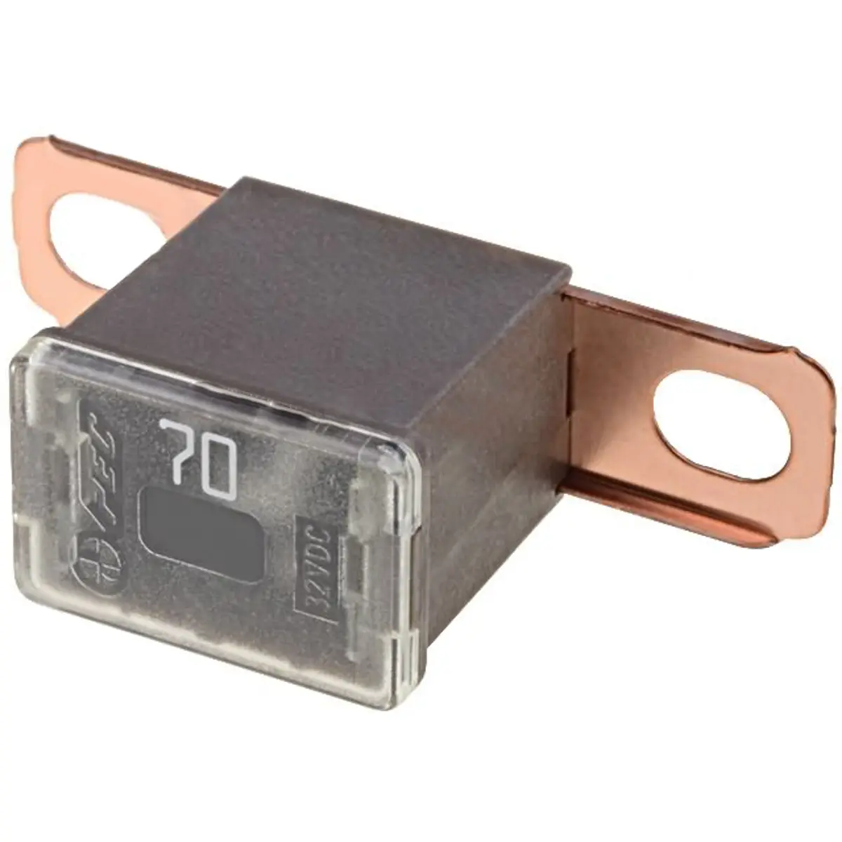 Fusível automotivo de baixa tensão com corrente nominal de 70A e tensão máxima de 32V, na cor castanha, concebido para proteção de circuitos elétricos em veículos. Oferece interrupção rápida da corrente em caso de sobrecarga, prevenindo danos e falhas. Compatível com sistemas de baixa tensão, fácil de substituir em instalações automotivas, sem referência à marca. Ideal para circuitos de proteção onde a segurança elétrica e a fiabilidade são determinantes.