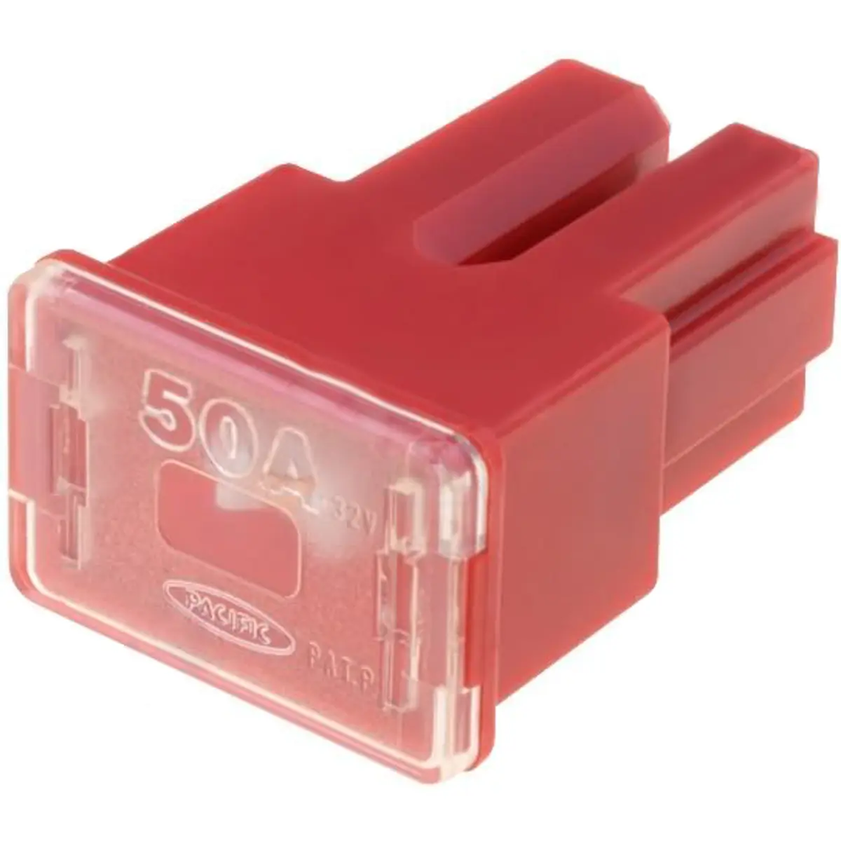 Fusível automotivo de baixa tensão com corrente nominal de 50 A e tensão máxima de 32 V. Proporciona proteção de circuitos elétricos em veículos, impedindo sobrecorrentes e curtos-circuitos, salvaguardando componentes sensíveis. Cor vermelha facilita a identificação e a verificação da instalação; adequado a aplicações automotivas que exigem segurança e fiabilidade.