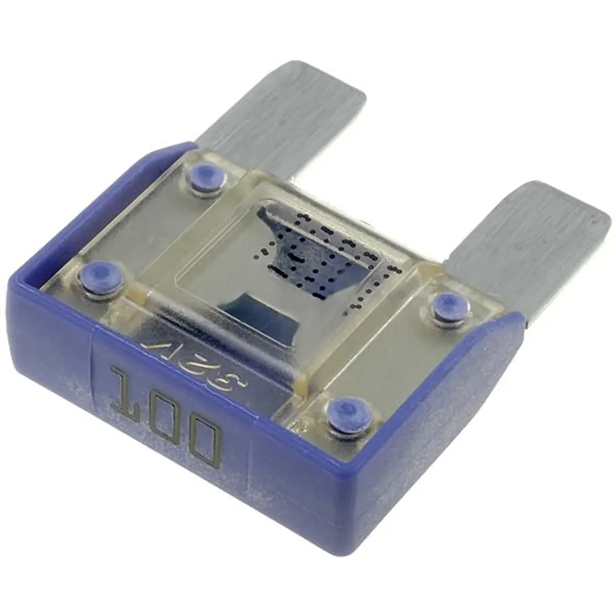 Fusível automotivo de baixa tensão com corrente nominal de 100A e tensão nominal de 32V, com tamanho de 29mm e cor roxo, concebido para proteção de circuitos elétricos em veículos. Ideal para instalações que requerem proteção rápida e recuperação estável, compatível com fusíveis automotivos padrão e fácil de substituir.