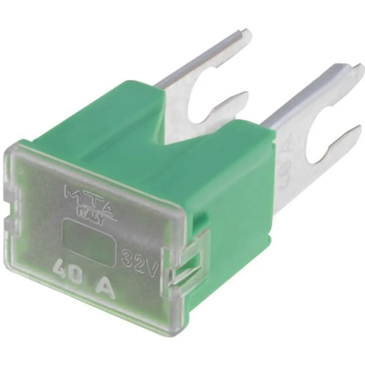 Fusível automotivo de baixa tensão com corrente nominal de 40A e tensão máxima de 32V, do tipo U e de cor verde, fabricado pela MTA, série JAPVAL. Destina-se à proteção de circuitos elétricos automotivos, oferecendo desconexão quando a corrente excede o valor nominal para evitar danos. Ideal para sistemas elétricos de baixa tensão em veículos, proporcionando fiabilidade e segurança na proteção elétrica automotiva.