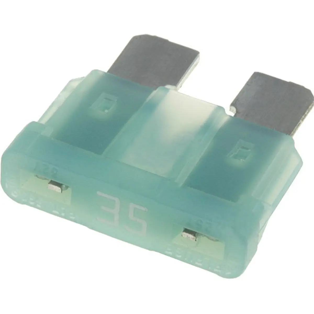Fusível automotivo de baixa tensão com corrente nominal de 35A e tensão nominal de 32V. Tamanho de 19mm, cor verde, da série ATO; ideal para proteção de circuitos elétricos em sistemas automotivos de baixa tensão.