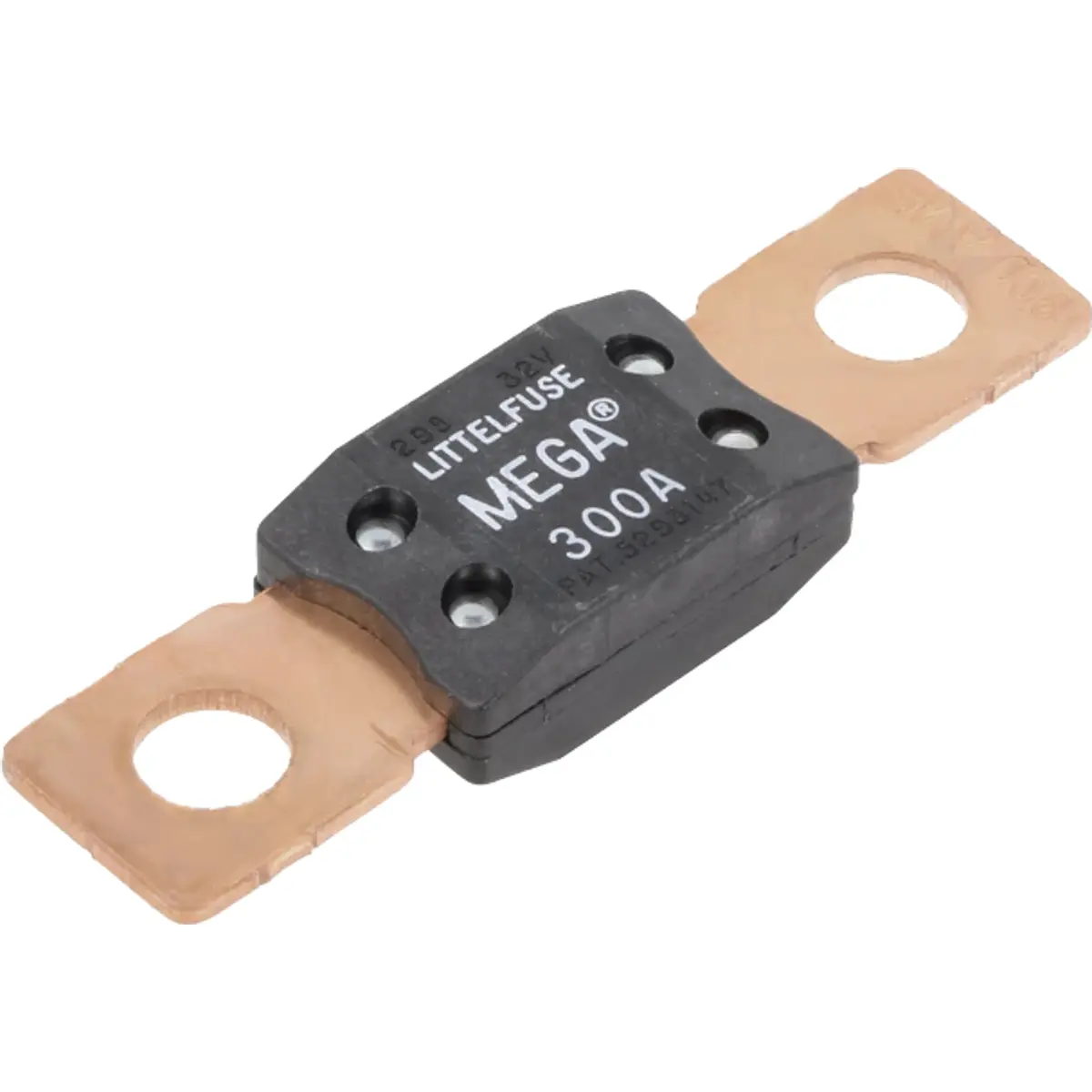 Fusível automotivo de baixa tensão, com tensão nominal de 32V e corrente de 300A, em tamanho de 68,6 mm. Possui cor preta, adequado para proteção de circuitos elétricos automotivos. Ideal para aplicações que requerem proteção contra sobretensões e curto-circuitos em veículos.