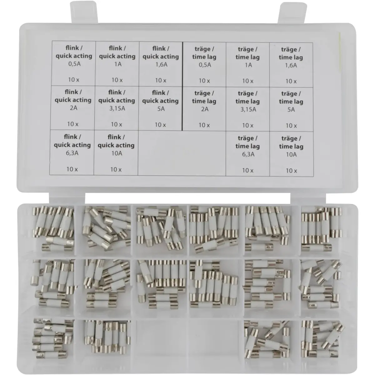 Sortido de fusíveis cerâmicos de 5x20mm com 160 unidades, organizadas em 16 grupos de 10 peças. Inclui correntes nominais de 0,5A, 1A, 1,6A, 2A, 3,15A, 5A, 6,3A e 10A, em versões Rápido e Lento. Ideal para proteção de circuitos elétricos, oferecendo opções de substituição prática e fiabilidade em diversas aplicações.