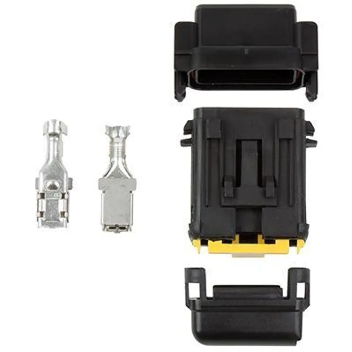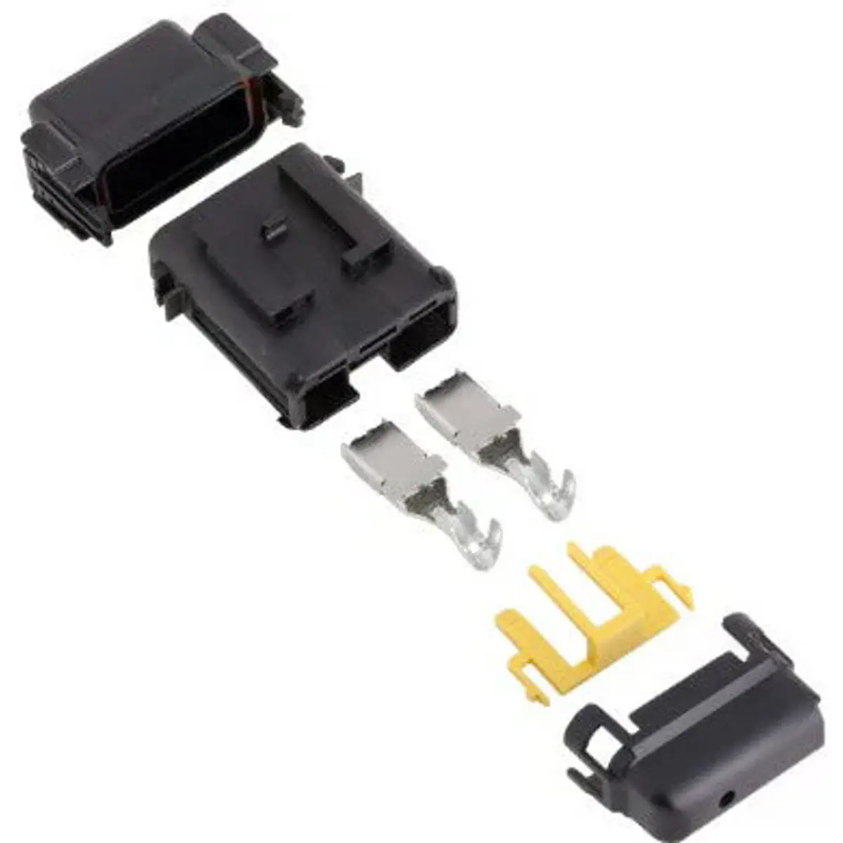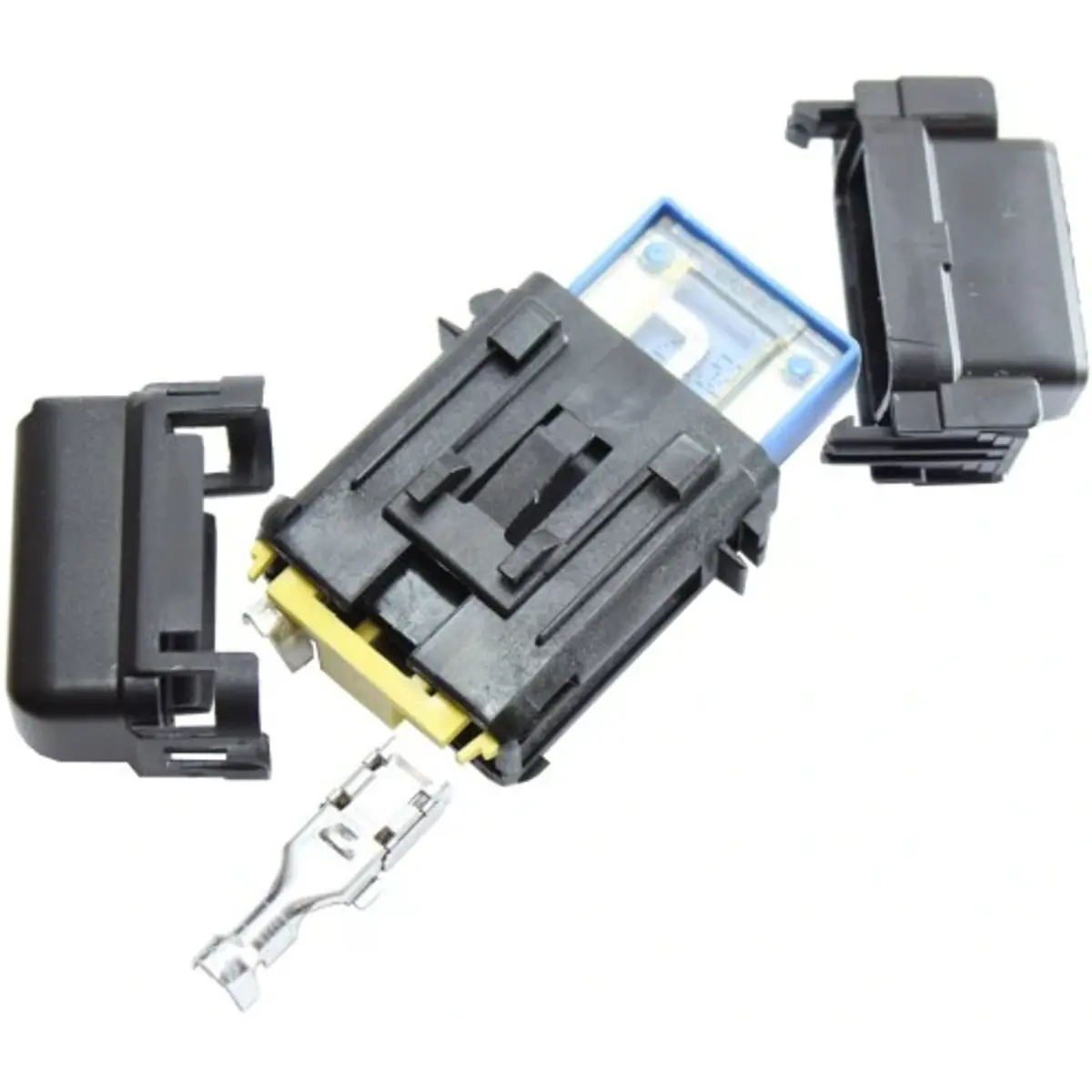 Porta-fusíveis Maxi de 29 mm para aplicações automotivas, com capacidade até 80 A e tensão máxima de 32 V. Fabricado em carcaça de poliamida 66, oferece montagem apertada com fio, contatos de cobre com cobertura estanhada e fio de secção 4-6 mm², assegurando boa condução e fiabilidade. Suporta temperaturas de -40 °C a 100 °C e atende à inflamabilidade UL94V-0. Inclui tomada com revestimento, e o conjunto contém dois terminais, tampa inferior e tampa superior com selo, além de uma tomada para fusível, facilitando a instalação segura e organizada.