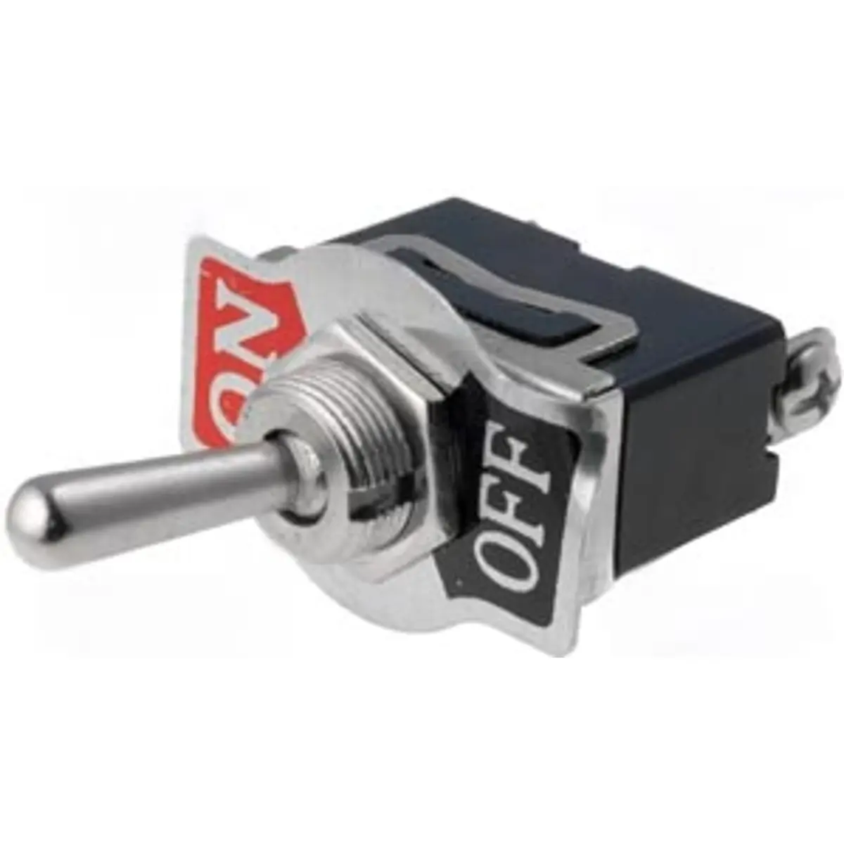 Interruptor de alavanca unipolar comutação ON-OFF de duas posições estáveis, tipo SPST. Suporta correntes nominais de 15A a 250VAC e 20A a 125VAC, com resistência de contacto de até 50 mΩ. A montagem é por parafusos M3 e a alavanca mede 17,5 mm. Dimensões do corpo: 29 x 15,8 x 19 mm; furação de painel de 12,2 mm. Funcionamento de -55°C a 65°C, atuador em metal e alavanca arredondada. Ciclos eléctricos: até 20000.