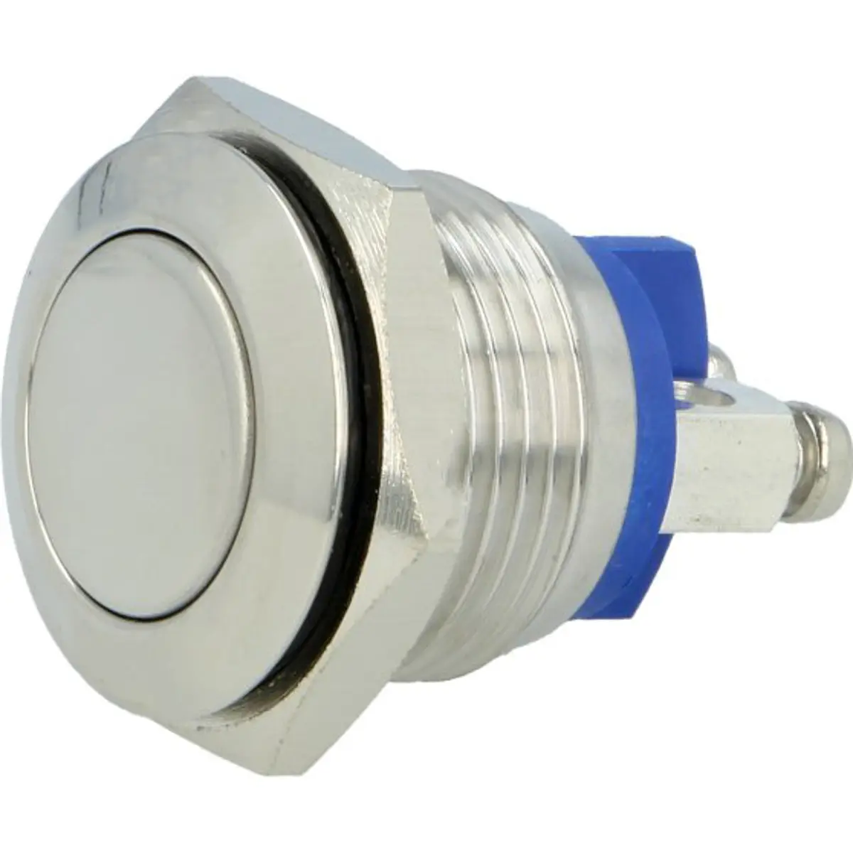 Interruptor de pressão antivandalismo unipolar SPST-NO, resistente a ambientes exigentes, com comutação OFF-(ON) a 36VDC/2A e grau de proteção IP65. Possui terminais de parafuso, montagem em Ø16 mm, corpo em aço inoxidável prateado e faixa de temperatura de funcionamento entre -20 e 55°C. Oferece elevada durabilidade com até 200000 ciclos elétricos e 1000000 ciclos mecânicos, resistência de contacto até 50 mΩ, torque de 4 N e suporta teste de 2 kV. Ideal para painéis e equipamentos expostos a vandalismo.