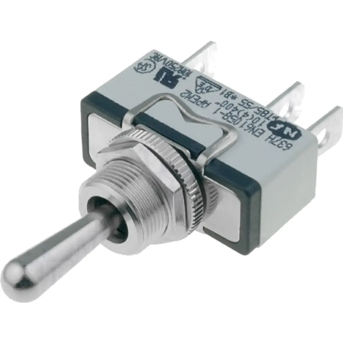 Interruptor de alavanca unipolar com comutação ON-OFF-ON, 3 posições e SP3T. Capaz de conduzir até 10 A a 250 V AC, com contactos em terminais. Dimensões compactas (29,5 x 14 x 15 mm) e furação de painel Ø12,2 mm, com alavanca de 17,5 mm. Durabilidade eléctrica de 10.000 ciclos e faixa de temperatura de funcionamento entre -20 °C e 55 °C. Perfeito para aplicações que exigem uma comutação estável em ambientes industriais.