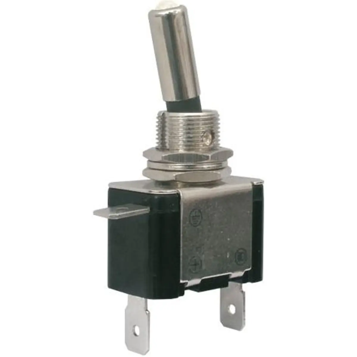 Interruptor de alavanca bipolar com dois pinos e LED branco. Comutação ON-OFF de duas posições, com dois contactos estáveis para funcionamento estável em circuitos DC. Suporta até 25 A a 12 V DC, oferecendo capacidade de interrupção para aplicações de alimentação. A pinagem é de terminais para soldar, facilitando a montagem em cablagem. Ideal para aplicações elétricas que exigem comutação simples, fiável e de fácil integração.