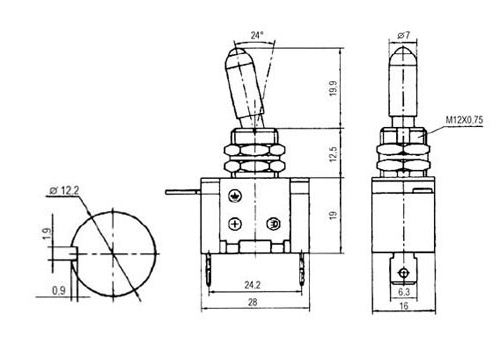 Interruptor de alavanca bipolar para montagem em circuitos elétricos, comutando entre ON e OFF. Possui 2 pinos de ligação e LED azul integrado para indicação de funcionamento. A pinagem é para soldar, permitindo uma montagem segura. Suporta até 25A a 12VDC, tornando-o adequado para o controlo de dispositivos de baixa potência em projetos de automação. Proporciona duas posições estáveis, oferecendo comutação fiável e instalação simples, sem referência a marcas.