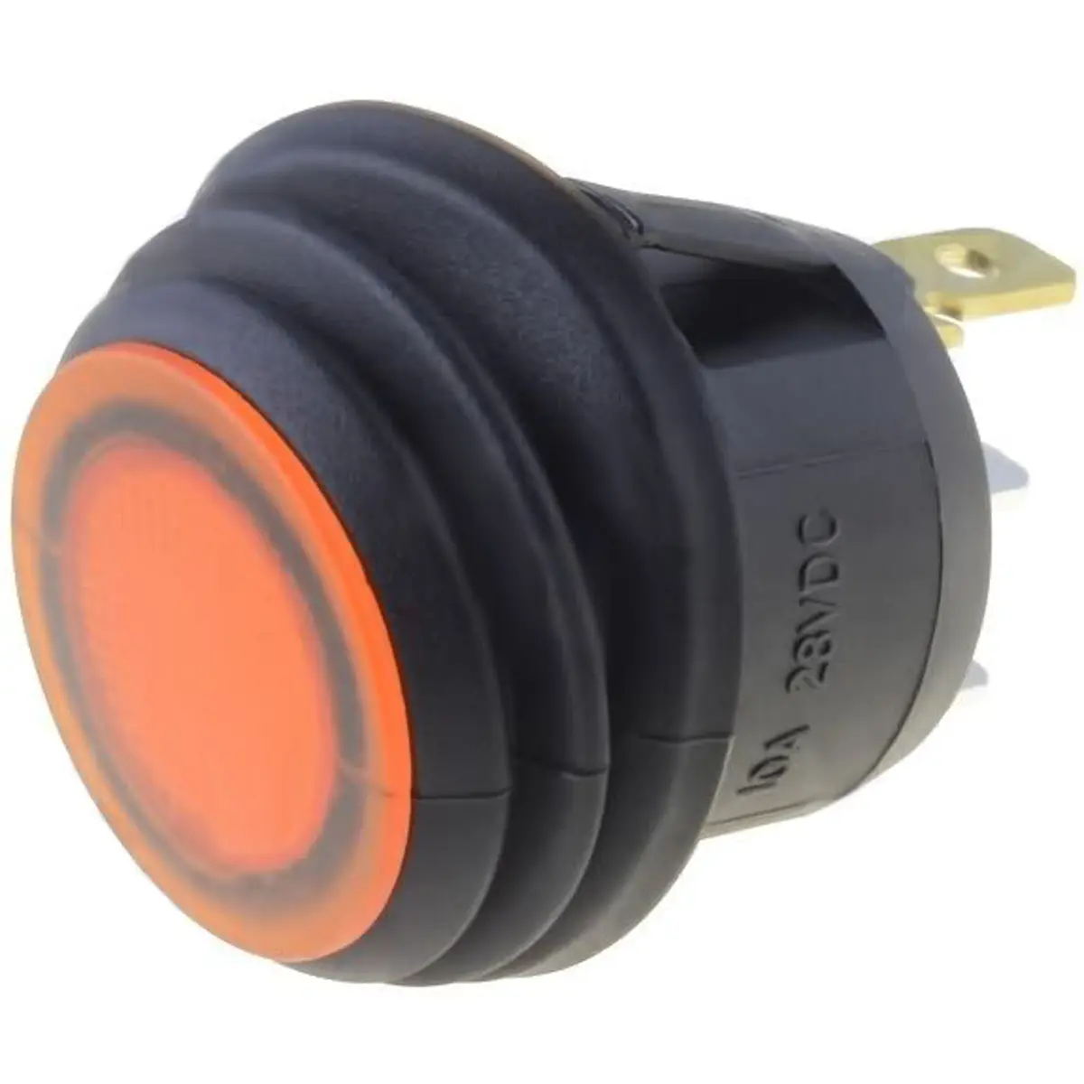 Botão basculante de montagem em painel com comutação OFF-ON em duas posições estáveis. Possui 3 pinos em configuração SPST, resistência de contacto até 50 mΩ e corrente de contacto até 10 A a 250 V AC. O botão é luminoso, com LED laranja, e utiliza terminais de 4,8 mm. Classe de inflamabilidade UL94V-2; espessura de painel até 2,5 mm e furação Ø20,2 mm, com dimensões Ø19,5 x 14,5 mm.