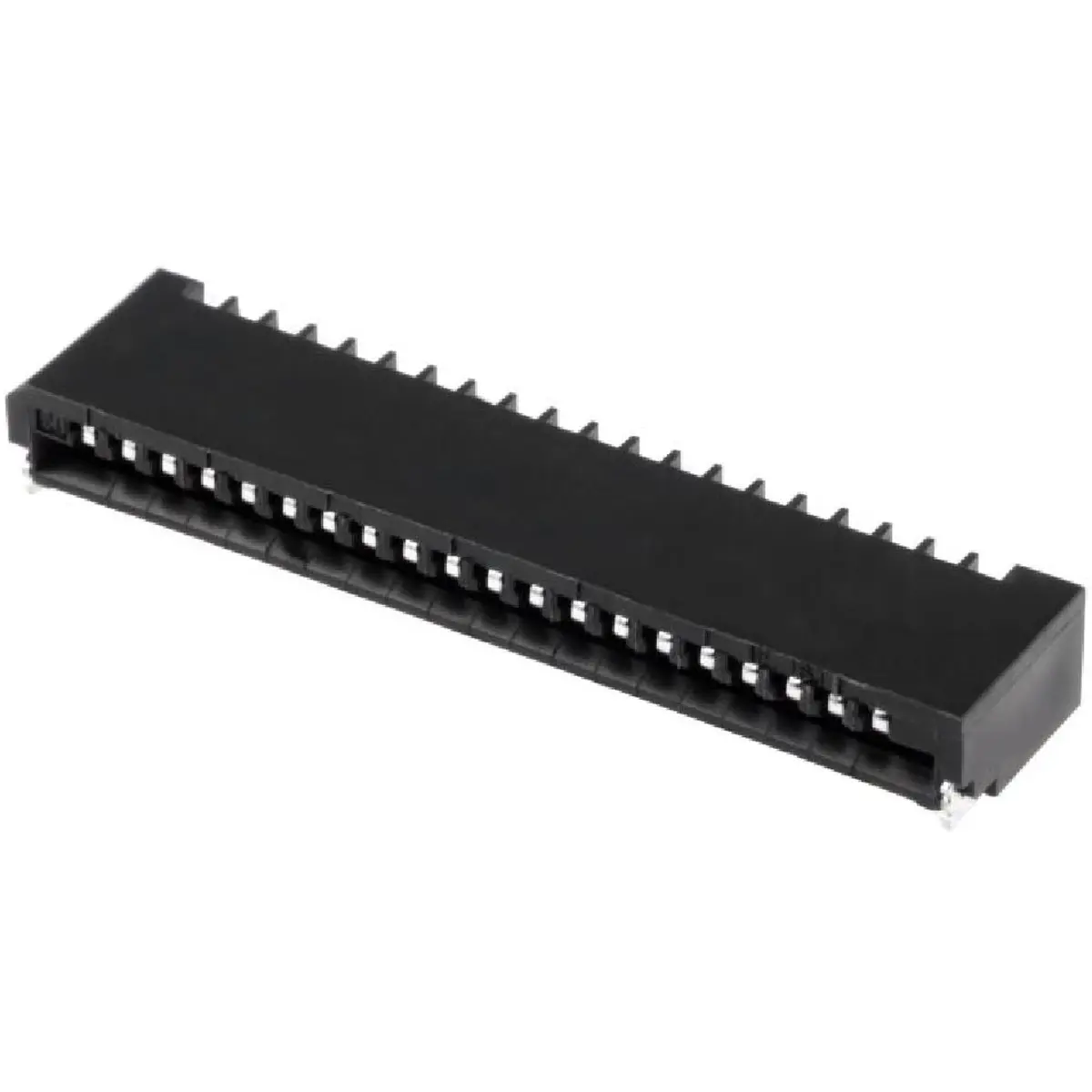 Conector FFC/FPC horizontal SMT para cablagem flat-cable de 1mm2. Suporta corrente máxima de 0,5 A e tensão até 50 V, funcionando entre -25 °C e 85 °C. Ideal para montagem SMT em PCB, oferecendo fiabilidade, compactação e integração em designs de elevada densidade de conectividade em dispositivos eletrónicos.