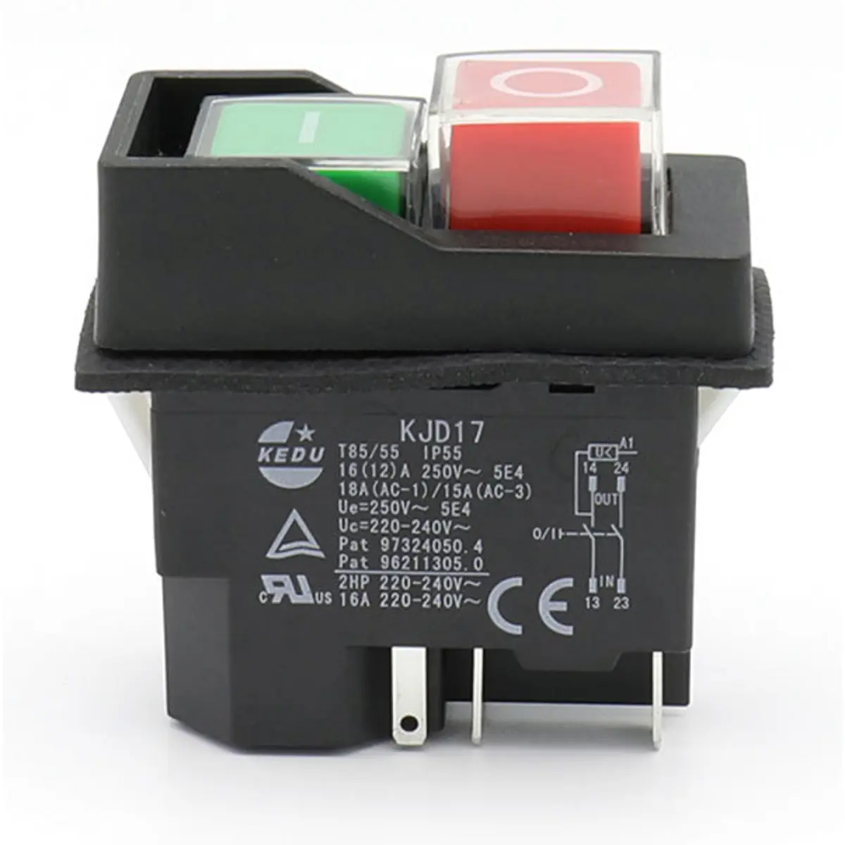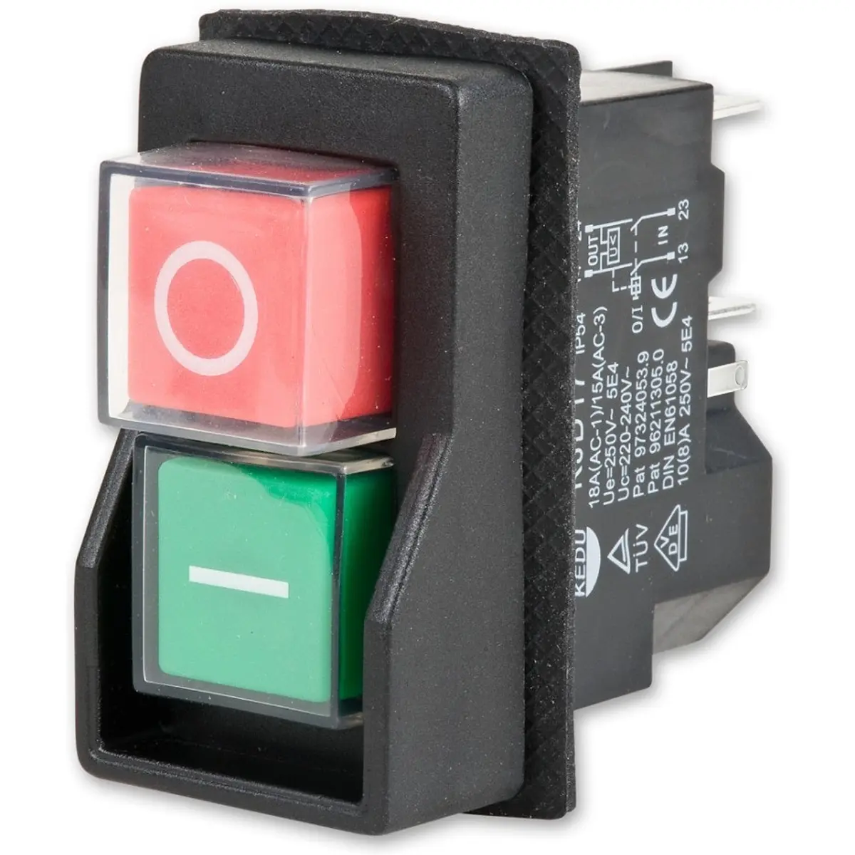Interruptor de pressão DPST de duplo pólo com função ON/OFF, preparado para 230 V AC e até 16 A. Montagem em painel com fixação Snap-In e terminal de rápida ligação de 6,3 mm. Possui classificação IP55, corpo em poliamida e teclas em verde e vermelho. Adequado para controlo seguro de máquinas e sistemas elétricos, oferecendo resistência ao pó e à água e compatibilidade com ligações elétricas em ambientes industriais.