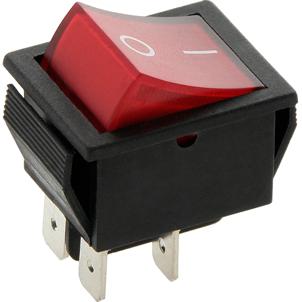 Interruptor basculante bipolar de 4 pinos comutação ON-OFF de duas posições estáveis, DPST, suportando até 15A a 250V AC. O botão é luminoso, vermelho, com lâmpada de néon. Pinagem de terminais 6,3 x 0,8 mm. Duração eléctrica de 10.000 ciclos, furação no painel de 22,3 x 31 mm, faixa de temperatura operacional entre -30°C e 80°C, altura acima do painel 9,4 mm. Capa de protecção Ref. 010-0550.