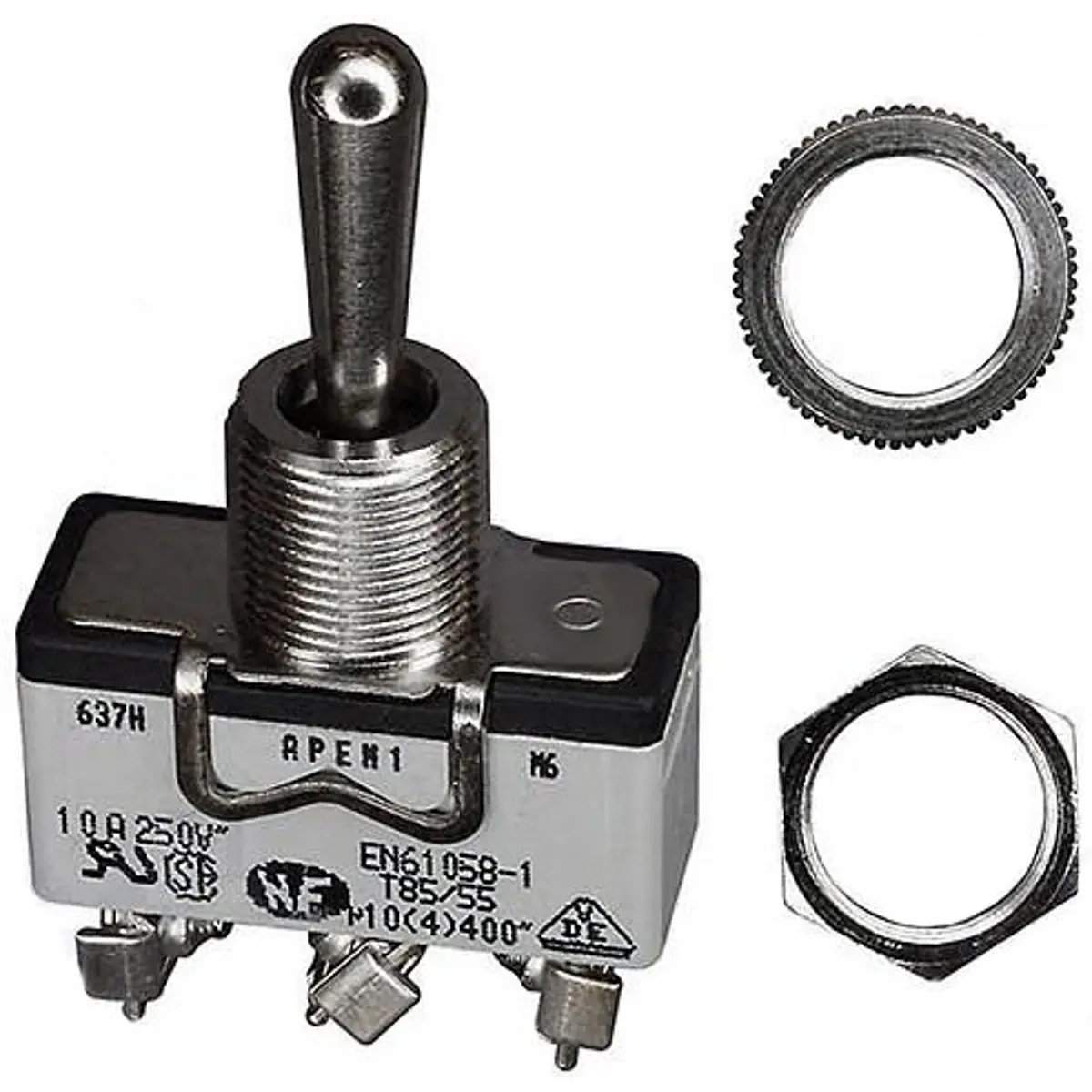 Interruptor de alavanca unipolar comutando em ON-OFF-ON, com SP3T e 3 posições, para controlo de circuitos elétricos. Capacidade de 10A a 250V AC com terminais de parafuso. Comprimento da alavanca 17,5 mm, furação do painel Ø 12,2 mm, dimensões 29,5 x 14 x 15 mm. Funciona entre -20°C e 55°C e suporta até 10.000 ciclos. Ideal para painéis elétricos de controlo.
