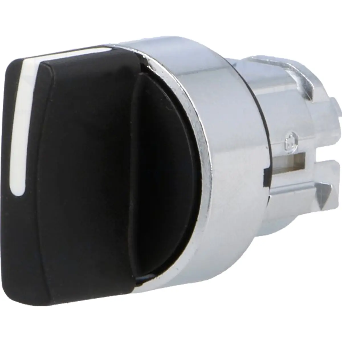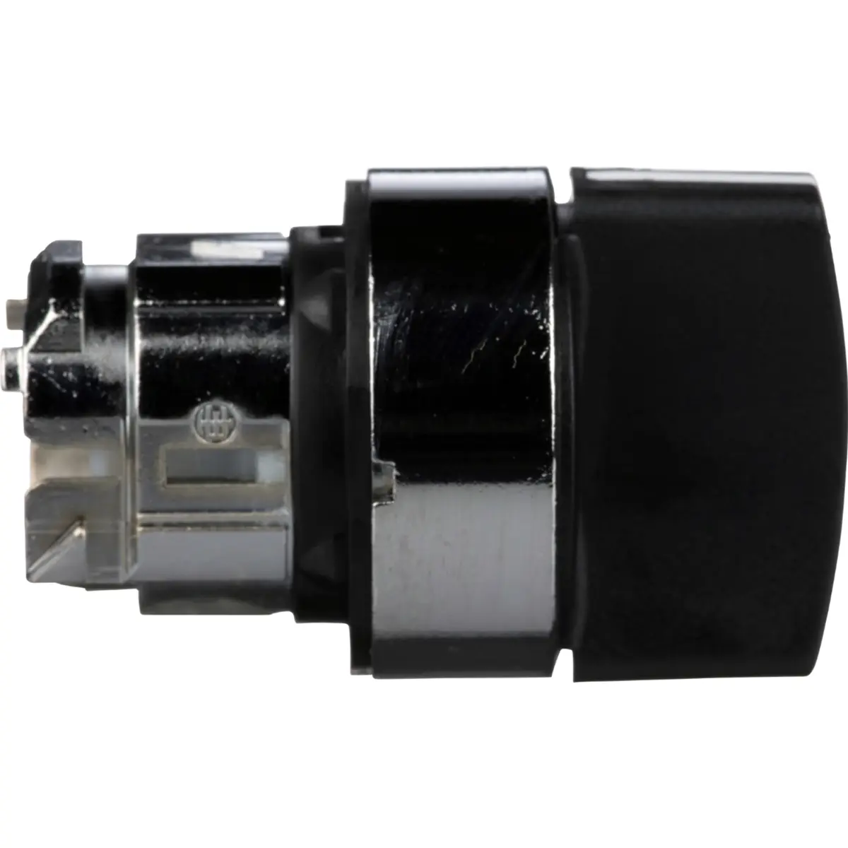Esta cabeça de interrutor seletor Harmony XB4, preta, com pega normal, tem 3 posições estáveis: uma ao centro, uma a 45° à esquerda e outra a 45° à direita.