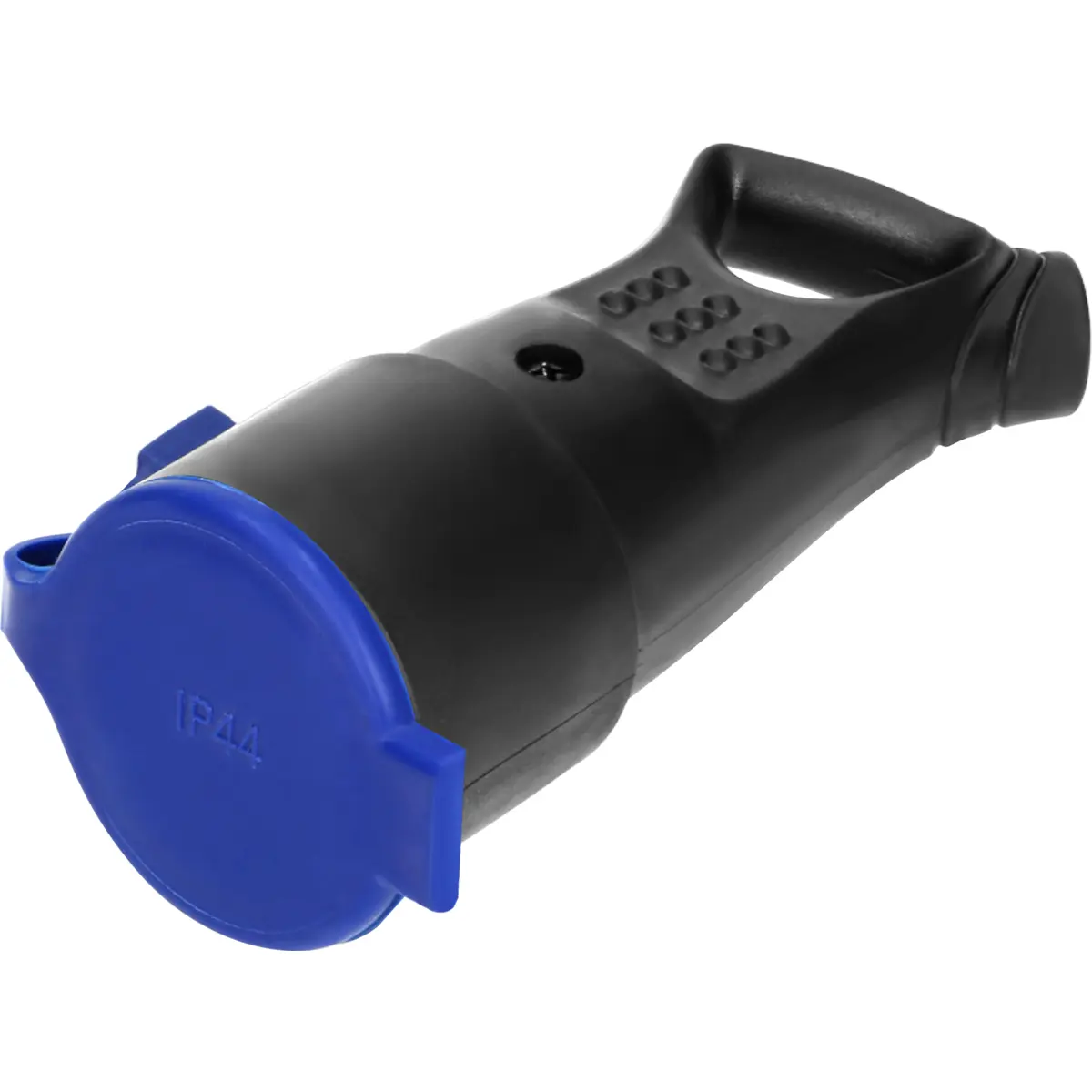 Tomada Schuko fêmea, em borracha preta com tampa e puxador, resistente IP44 para uso em ambientes húmidos ou expostos. Suporta até 250V e 16A, com materiais de borracha e PVC que asseguram durabilidade e proteção. Design compacto com tampa protetora que impede infiltrações de poeira e água, ideal para aplicações exteriores, instalações elétricas temporárias e equipamentos sensíveis. Fácil integração em estruturas de proteção e fácil manuseamento, graças ao puxador integrado.