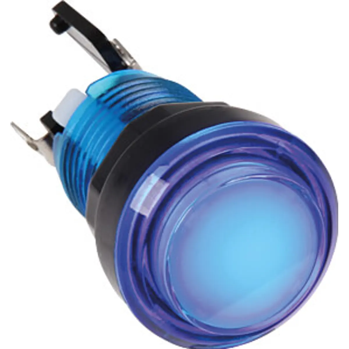 Botão de pressão para arcade com microswitch OFF-(ON) e iluminação azul. Alimentação de 12 V e LED de 5 V. Construção em nylon de alta qualidade, com furação Ø27,5 mm e diâmetro Ø30 mm, adequado para montagem em painéis de arcades, oferecendo toque tátil fiável e visual atrativo.