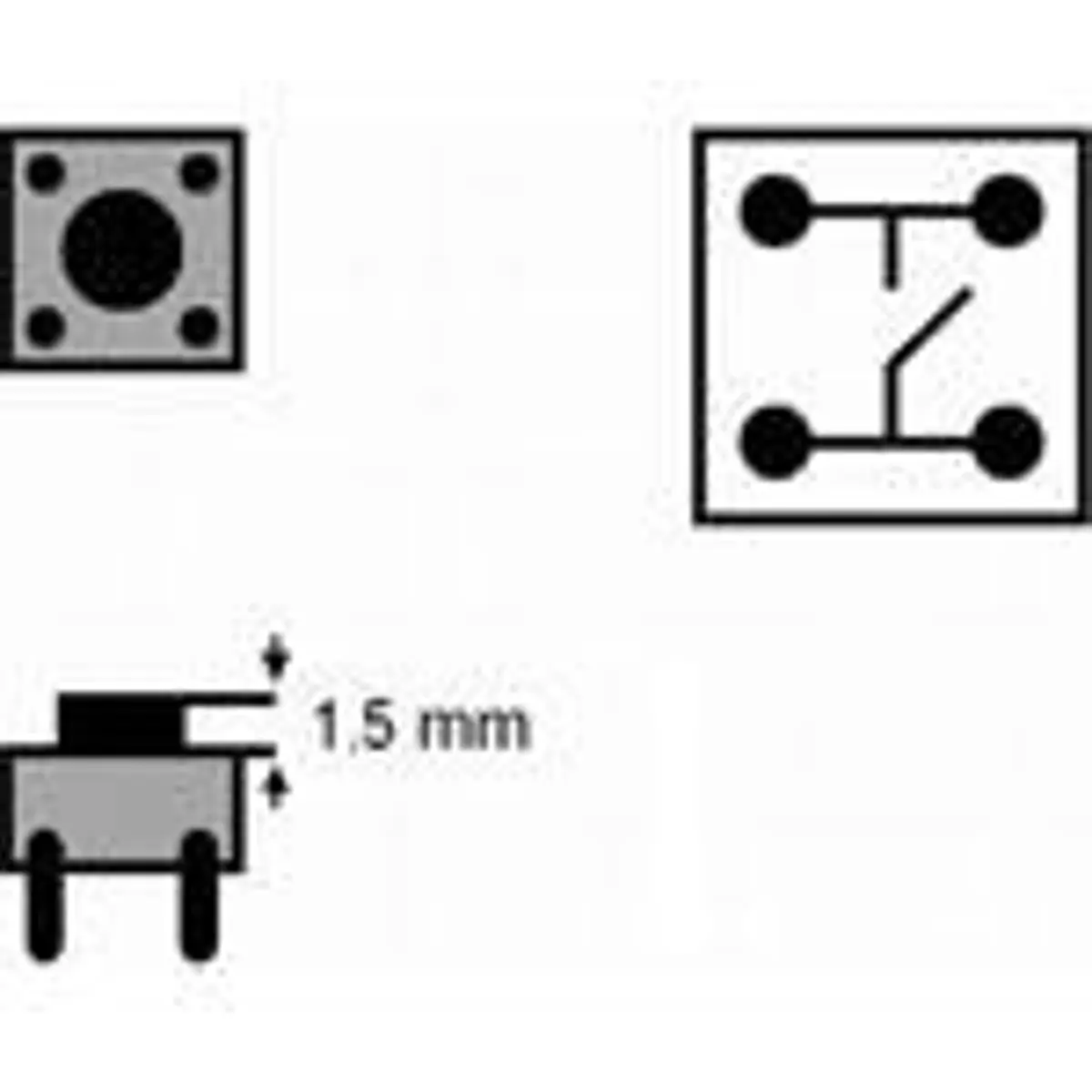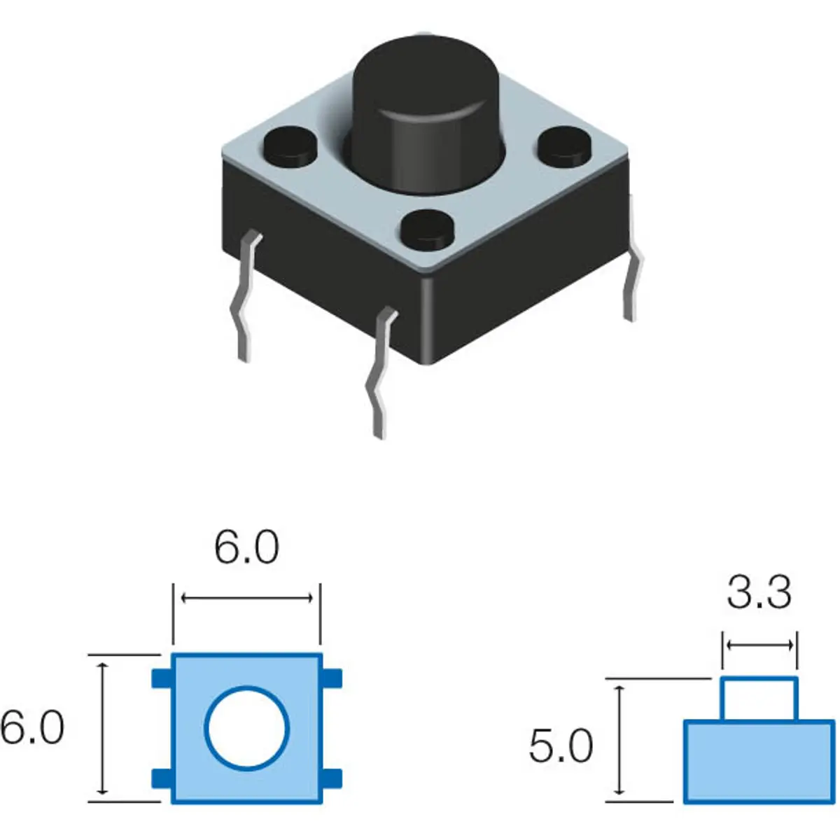 Botão miniatura com formato de 6x6 mm e altura total de 5 mm. Contatos de 12 VDC a 50 mA, resistência até 100 Mohm. Dimensões 6x6 mm, altura do botão 1,5 mm. Pressão de funcionamento 160 ± 30 gf. Vida útil de até 100.000 ciclos. Ideal para montagens em espaços reduzidos onde é necessária durabilidade.
