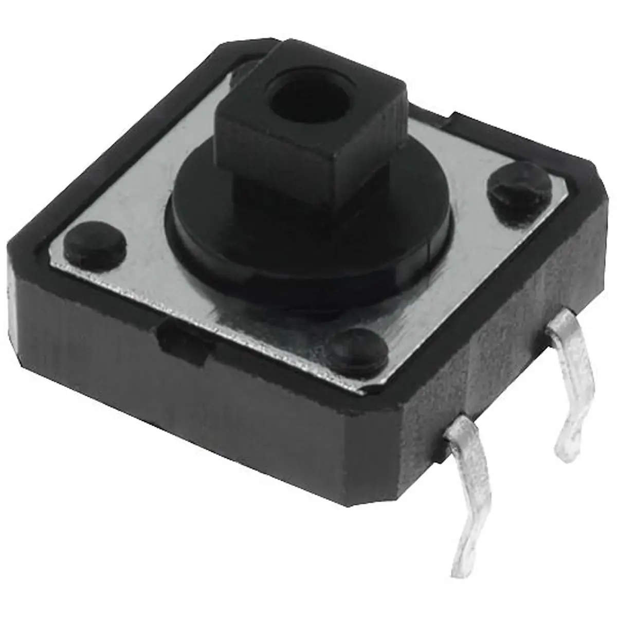 Botão microswitch SPST-NO com tensão até 12VDC e 50mA. Torque de acionamento de 1,27N, altura de 7,3 mm medida desde a PCB e dimensões de 12x12 mm, adequado para aplicações compactas que exigem comutação simples e fiável em espaços reduzidos.