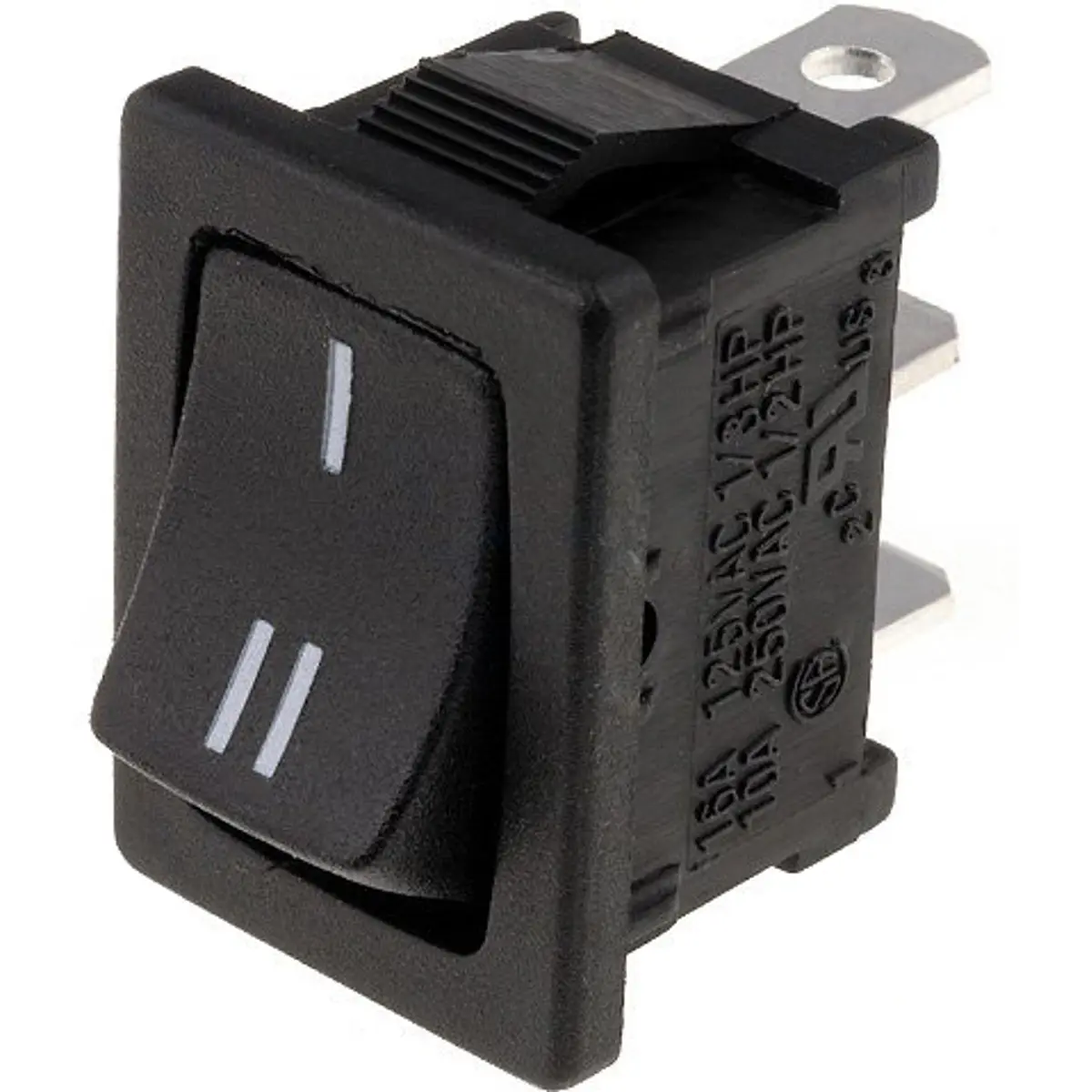 Botão basculante unipolar com posição estável e contactos SPDT, comutação ON-(ON). Suporta 250V AC a 10A e 12V DC a 16A, resistência de contactos até 50 mΩ. Fabricado em poliamida, cumpre UL94V-2 e funciona entre -20°C e 85°C. Os terminais são de 4,8 x 0,8 mm e o diâmetro de furação do painel é ≤ 3 mm. Possui durabilidade eléctrica de cerca de 6000 ciclos e monta-se num painel de 19,4 x 13 mm, ideal para aplicações de controlo.