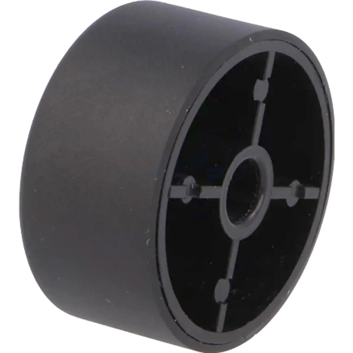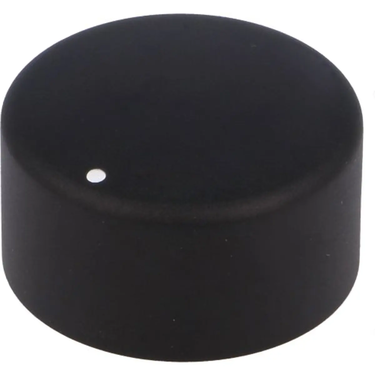 Botão de encaixe para potenciómetro com indicador, diâmetro Ø31x17mm, veio de 6mm. Possui superfície estriada e montagem por pressão. Fabricado em termoplástico preto com indicador branco, oferece uma leitura de posição clara e montagem rápida em painéis.