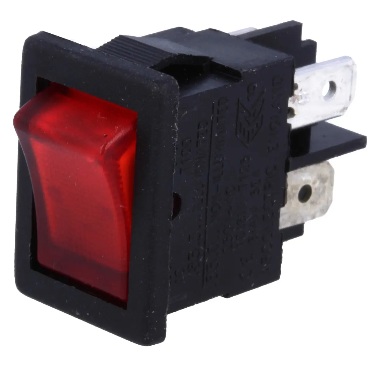Interruptor basculante de duas posições estáveis com comutação ON-OFF, adequado para controlo de circuitos AC e DC. O dispositivo suporta contactos DPST e permite 10 A a 250 VAC e 10 A a 28 VDC. Possui botão vermelho com iluminação de néon a 230 V, encapsulamento preto e dimensões de montagem de 19,3 x 12,9 mm. Os quatro terminais, de 4,8 x 0,8 mm, promovem uma instalação simples e segura em diversos painéis, operando dentro de -25 °C a 85 °C. Ideal para comutação fiável em aplicações industriais.