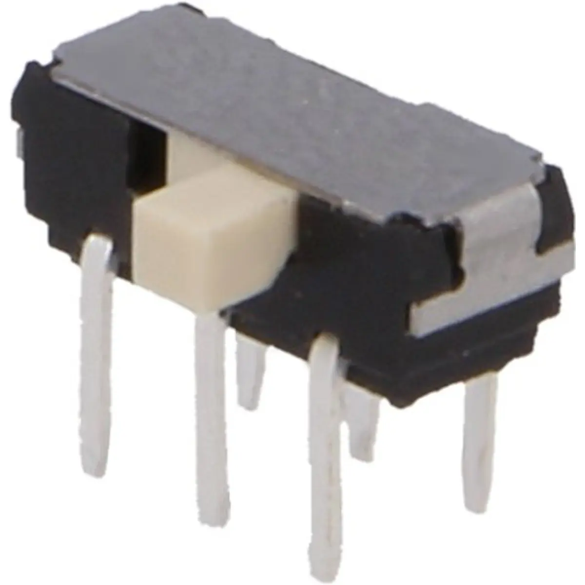 Interruptor deslizante de 2 posições estáveis com contactos DPDT e comutação ON-ON. Suporta 0.3A a 6VDC, montagem THT para PCB, dimensões de 9x3.5x3.5 mm e temperatura de funcionamento entre -25°C e 70°C. Ideal para circuitos que exigem alternância entre estados sem consumo de energia, com fiabilidade e montagem simples.