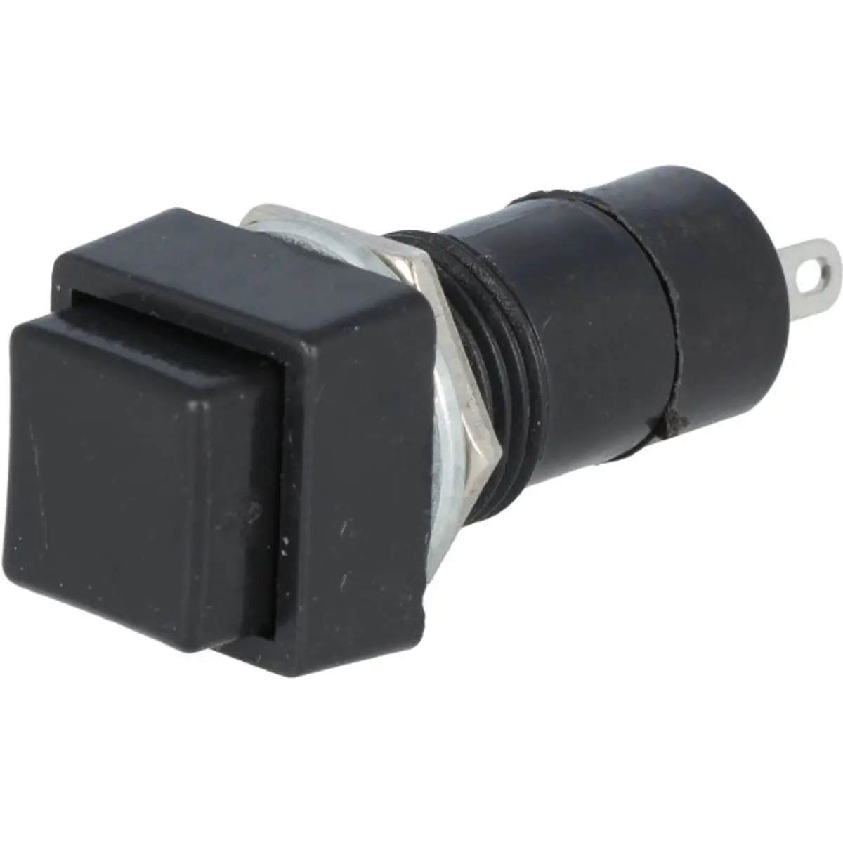 Botão interruptor de pressão para montagem em painel com comutação OFF-(ON) e contactos SPST-NO, suportando 3 A a 125 VAC. Fabricado para funcionamento entre -25°C e 70°C, com corpo preto e terminais para soldar. Dimensão de montagem Ø12 mm. Possui resistência de contacto baixa (≈20 mΩ) e alta durabilidade eléctrica (50.000 ciclos) e mecânica (100.000 ciclos). Ideal para painéis de controlo em sistemas elétricos que exigem fiabilidade e resposta tátil.