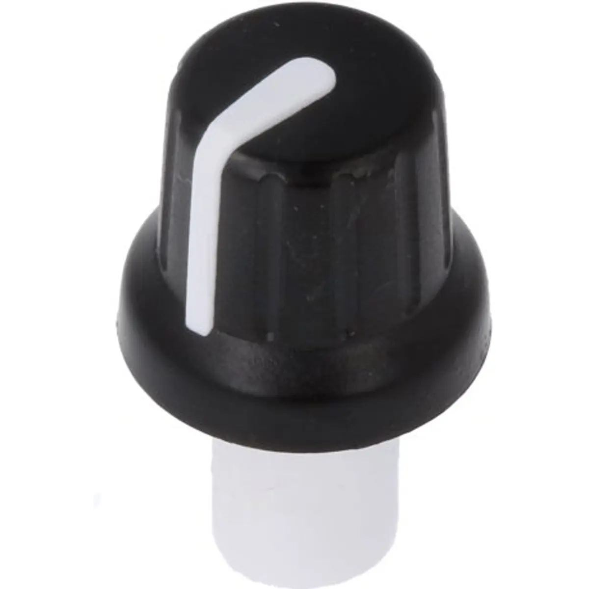 Botão de encaixe para potenciómetro com indicador, montagem em painel, fabricado em ABS, nas cores preto e branco. Diâmetro interior de 6 mm e dimensões do botão Ø16 x 14,4 mm. Ideal para painéis de controlo, instrumentos e equipamentos eletrónicos, fornecendo indicação visual clara e montagem estável. Compatível com potenciómetros de encaixe padrão, para um acabamento fiável e moderno.