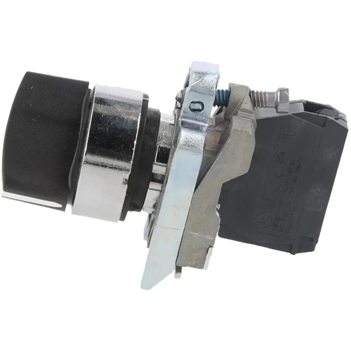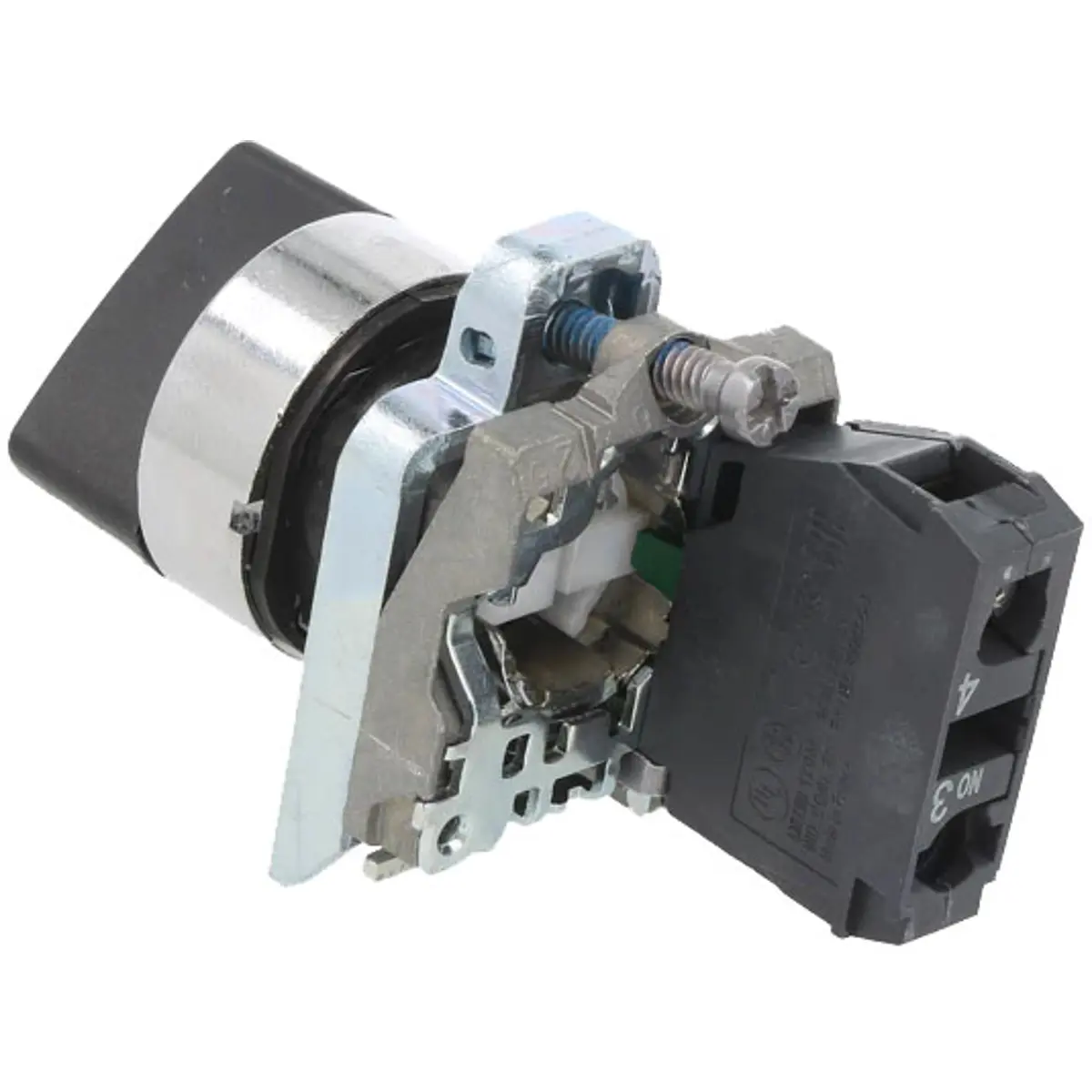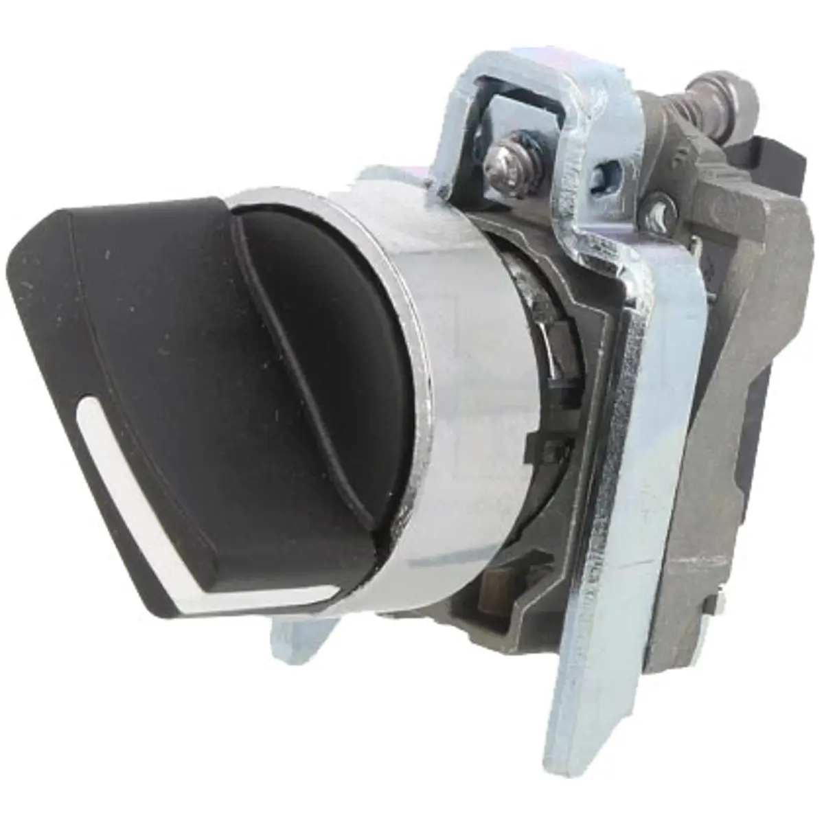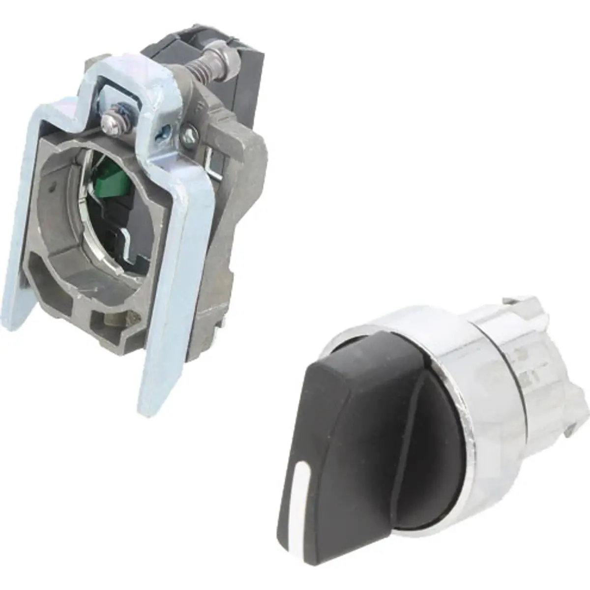 Interrutor seletor (rotativo) da linha Harmony XB4, modular preto, com 2 posições estáveis e um contacto Normalmente Aberto (NO).
