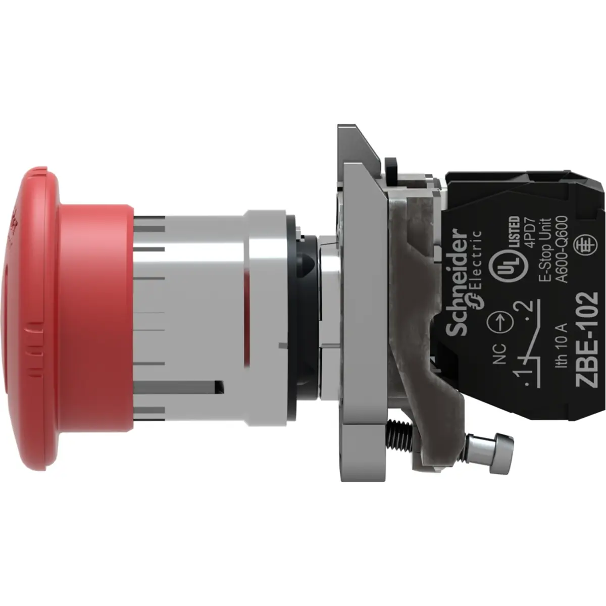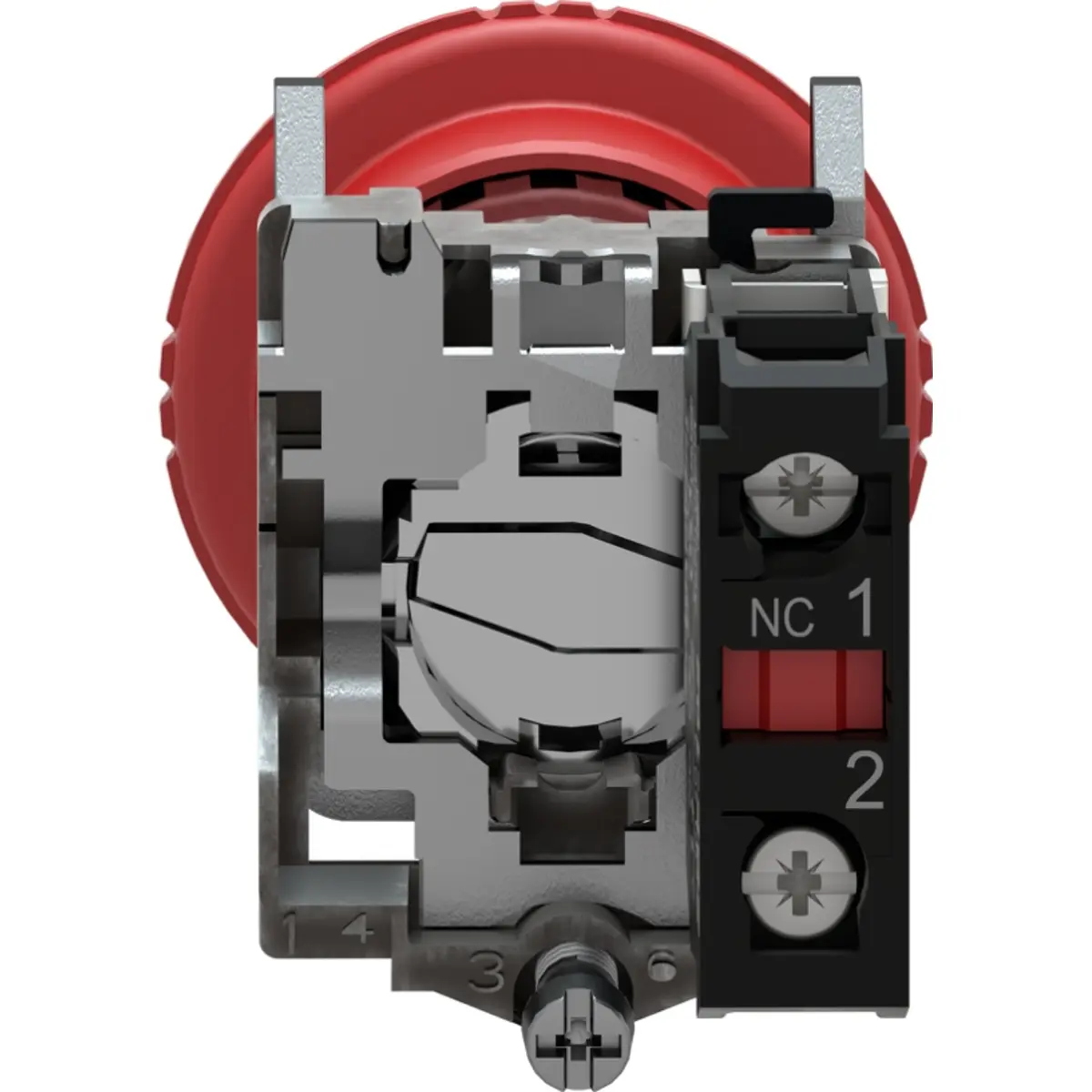O XB4BS8442 é um botão de paragem de emergência, com cabeçote do tipo cogumelo vermelho, da linha Harmony XB4, com estrutura metálica, que opera com mecanismo de girar para destravar e possui um contato Normalmente Fechado (NC).